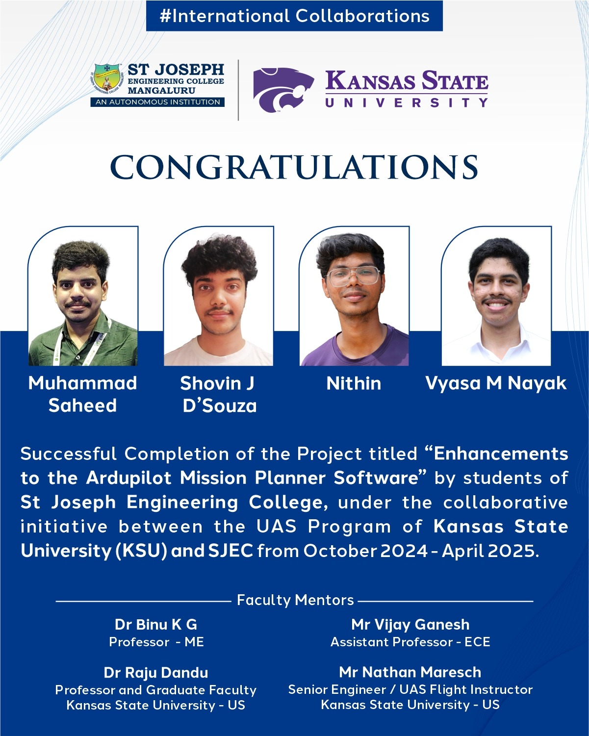 St Joseph Engineering College (SJEC), Mangaluru, is delighted to announce the successful completion of the international collaborative project titled “Enhancements to the Ardupilot Mission Planner Software.”