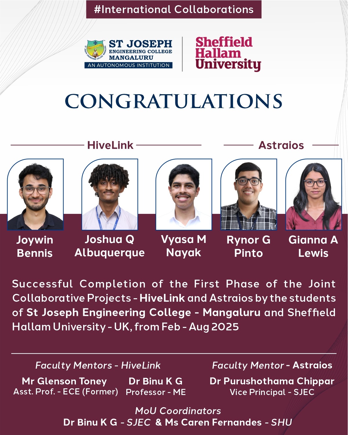 St Joseph Engineering College (SJEC), Mangaluru, proudly announces the successful completion of the first phase of the joint collaborative projects HiveLink and Astraios, carried out by students of SJEC and Sheffield Hallam University (SHU), UK from February to August 2025.