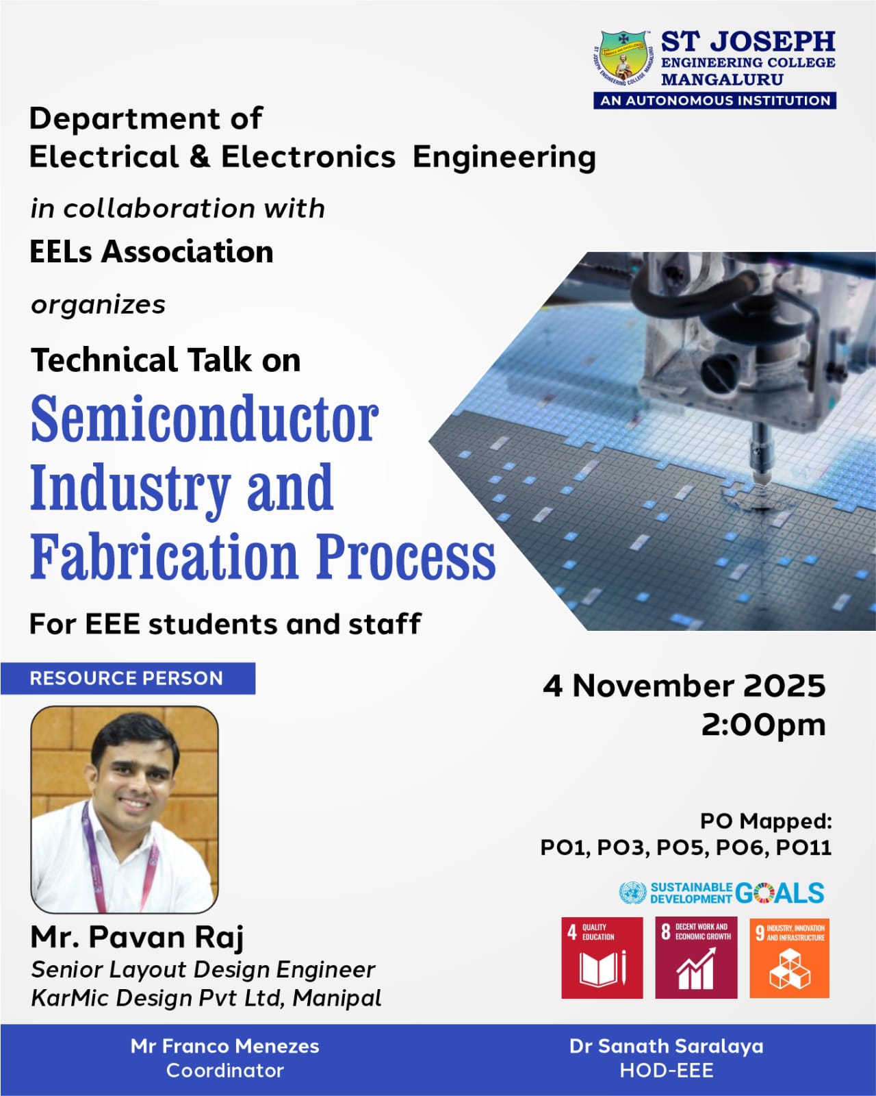 The Department of Electrical and Electronics Engineering, in association with the EELs Association, organized a technical talk on “Semiconductor Industry and Fabrication Process” for the final-year EEE students on 04 November 2025. Mr Pavan Raj, Senior Layout Design Engineer, KarMic Design Pvt Ltd,Manipal was the resource person.