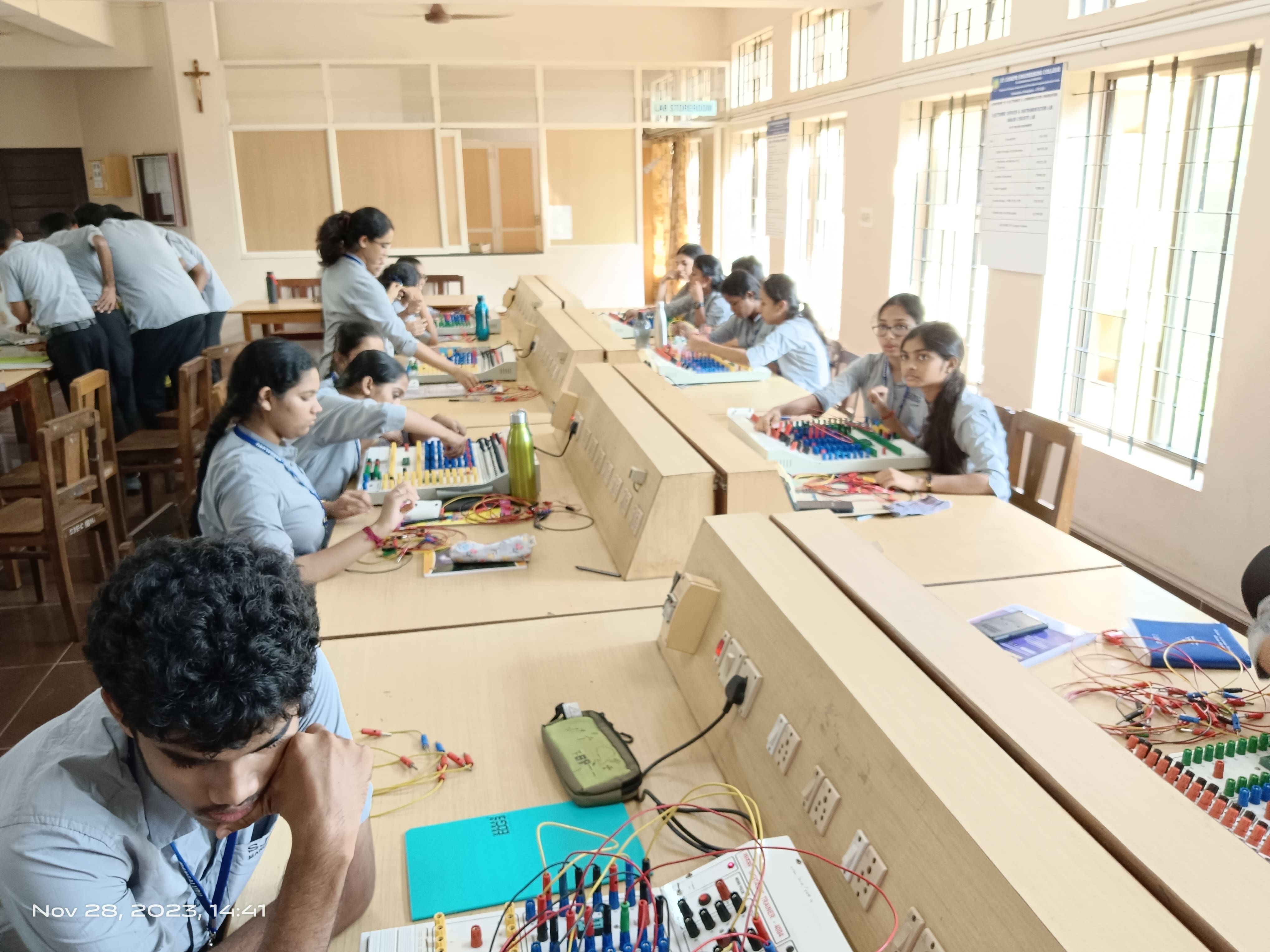 Digital Storage Oscilloscopes (DSO),100MHz, 60MHz 2+16 Channel MSO, Signal Generators(2MHz), Arbitrary Function Generator(25MHz), Fixed Power Supply(+/- 15V), Variable Power Supply(0 – 32V), Power Supply(5V), Analog IC Tester, Decade R,L,C boxes, DSBSC Kits, Frequency Mixer Kits, Pulse Position Modulator & Demodulator kit, SSB system Trainer kit, Pulse Width Modulator & Demodulator kit, Digital Multimeters, Desktop Computers(Intel i7,8 GB RAM,500 GB HDD,240 GB SSD, Windows 10), MATLAB R2025a Software, NI Multisim 14.2 Software, LCD Projector, Printer |