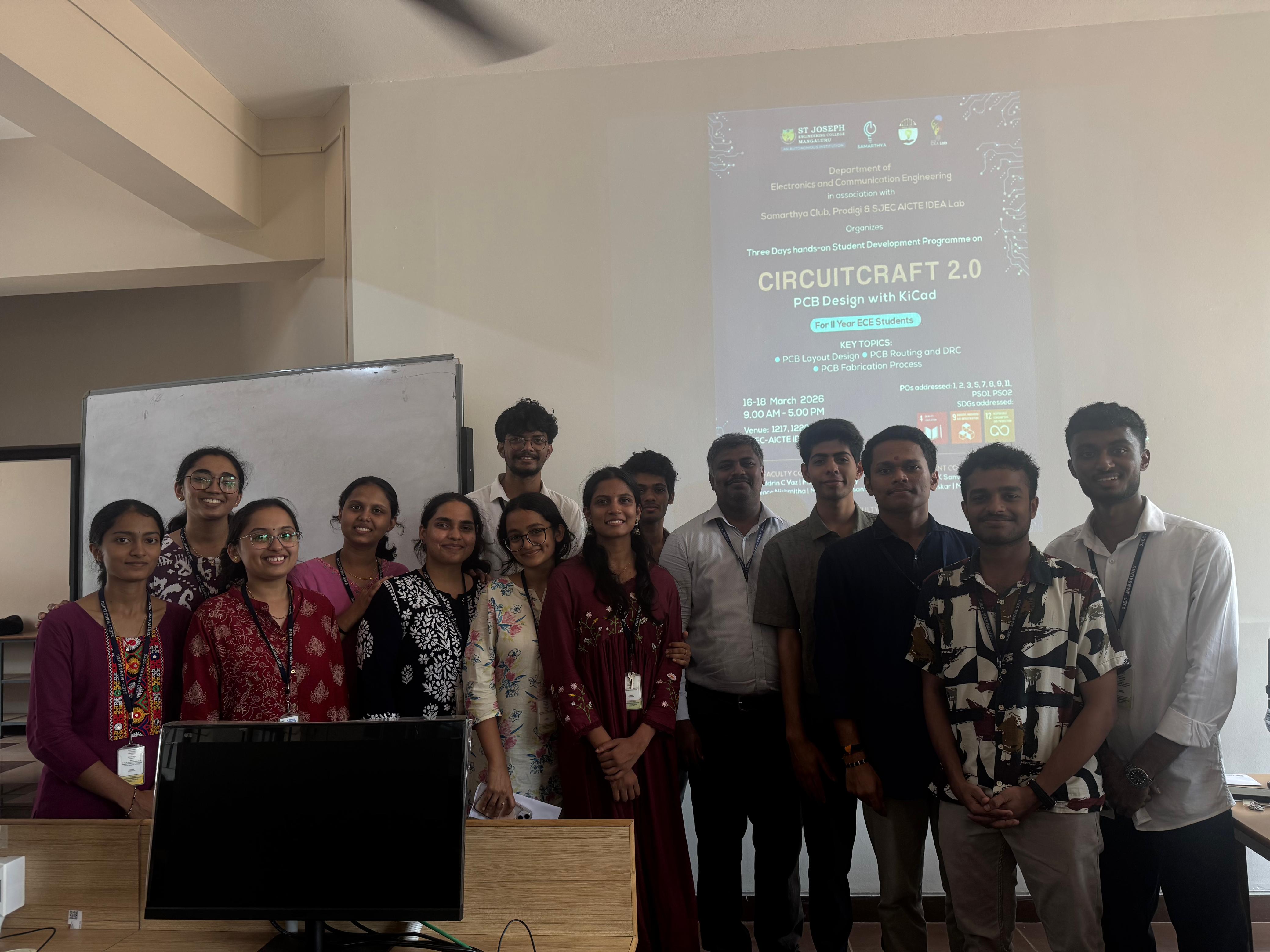 The Department of Electronics and Communication Engineering, in association with the Samarthya Club, Prodigi Association, and the SJEC AICTE IDEA Lab, successfully conducted a three-day hands-on Student Development Program (SDP) titled “CircuitCraft: PCB Design Using KiCad” from 04 to 06 February 2026 for 6th semester ECE students, followed by “CircuitCraft 2.0: PCB Design Using KiCad” from 16 to 18 March 2026 for 4th semester ECE students.