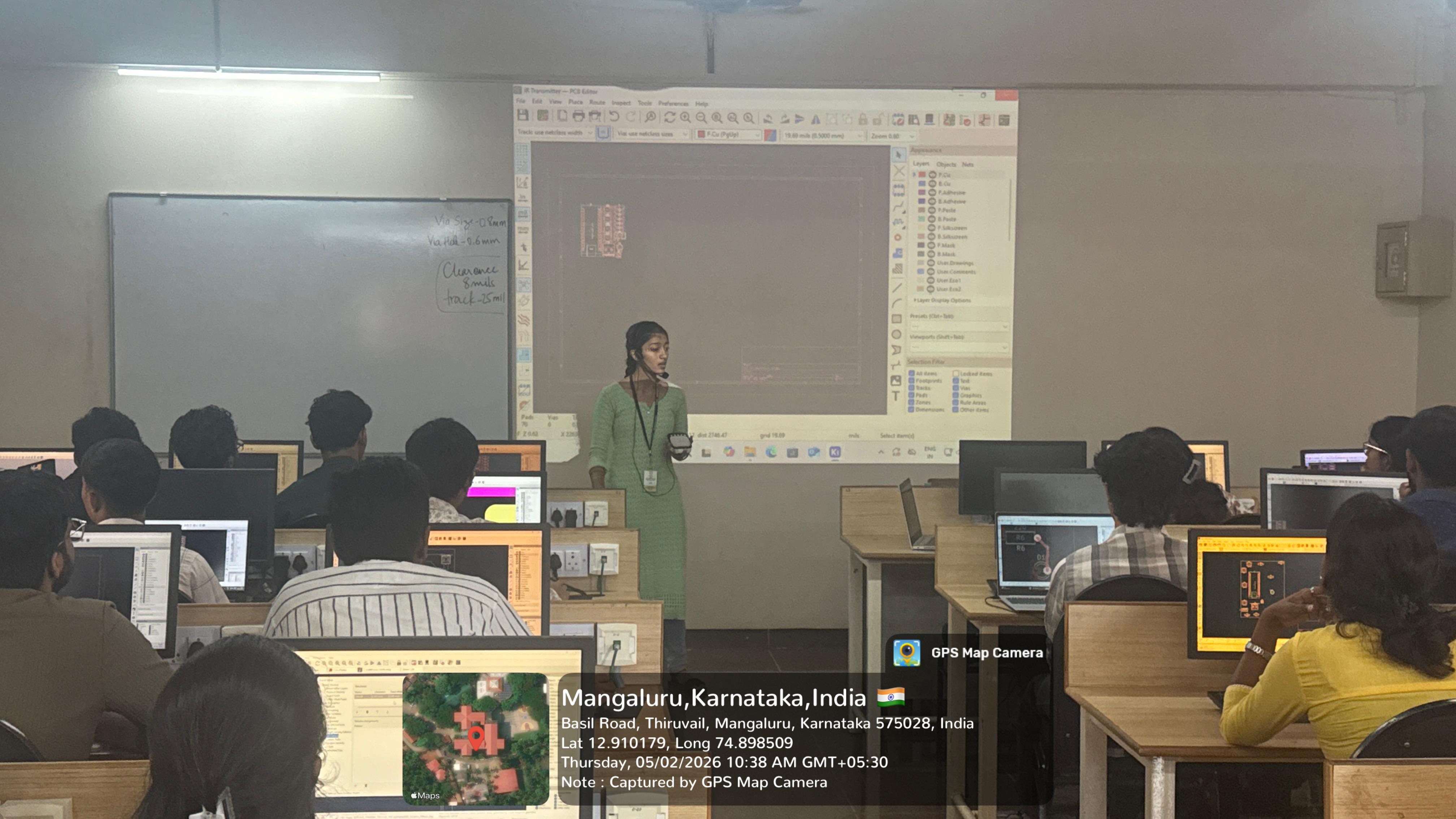 As part of the hands-on sessions, students designed and developed an Infrared (IR) receiver circuit, converting their schematics into functional PCB layouts. The training emphasized real-time troubleshooting, design optimization, and adherence to best practices in PCB design. Overall, the program significantly enhanced students’ practical skills and confidence in independently executing hardware projects, effectively bridging the gap between theoretical knowledge and real-world application.