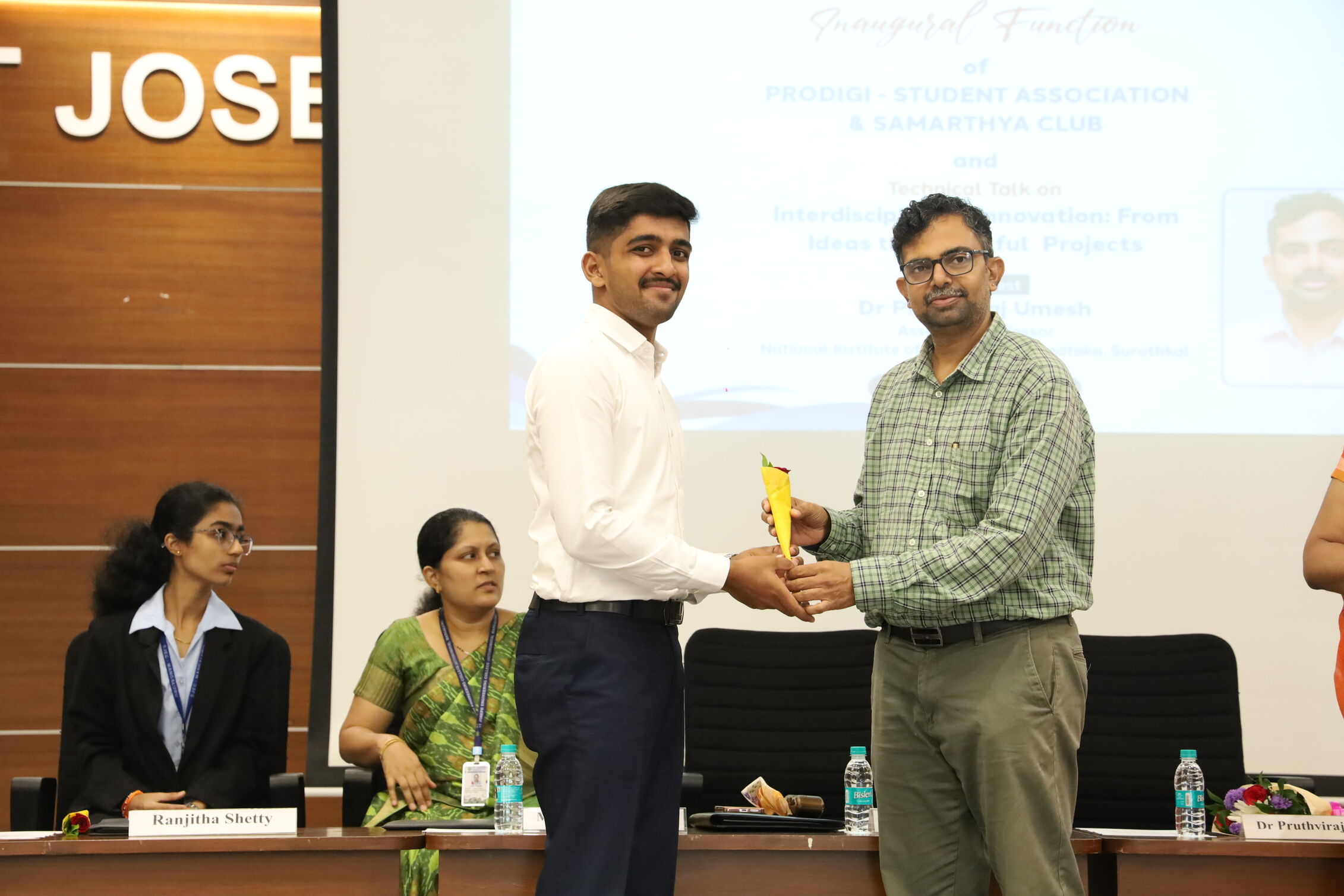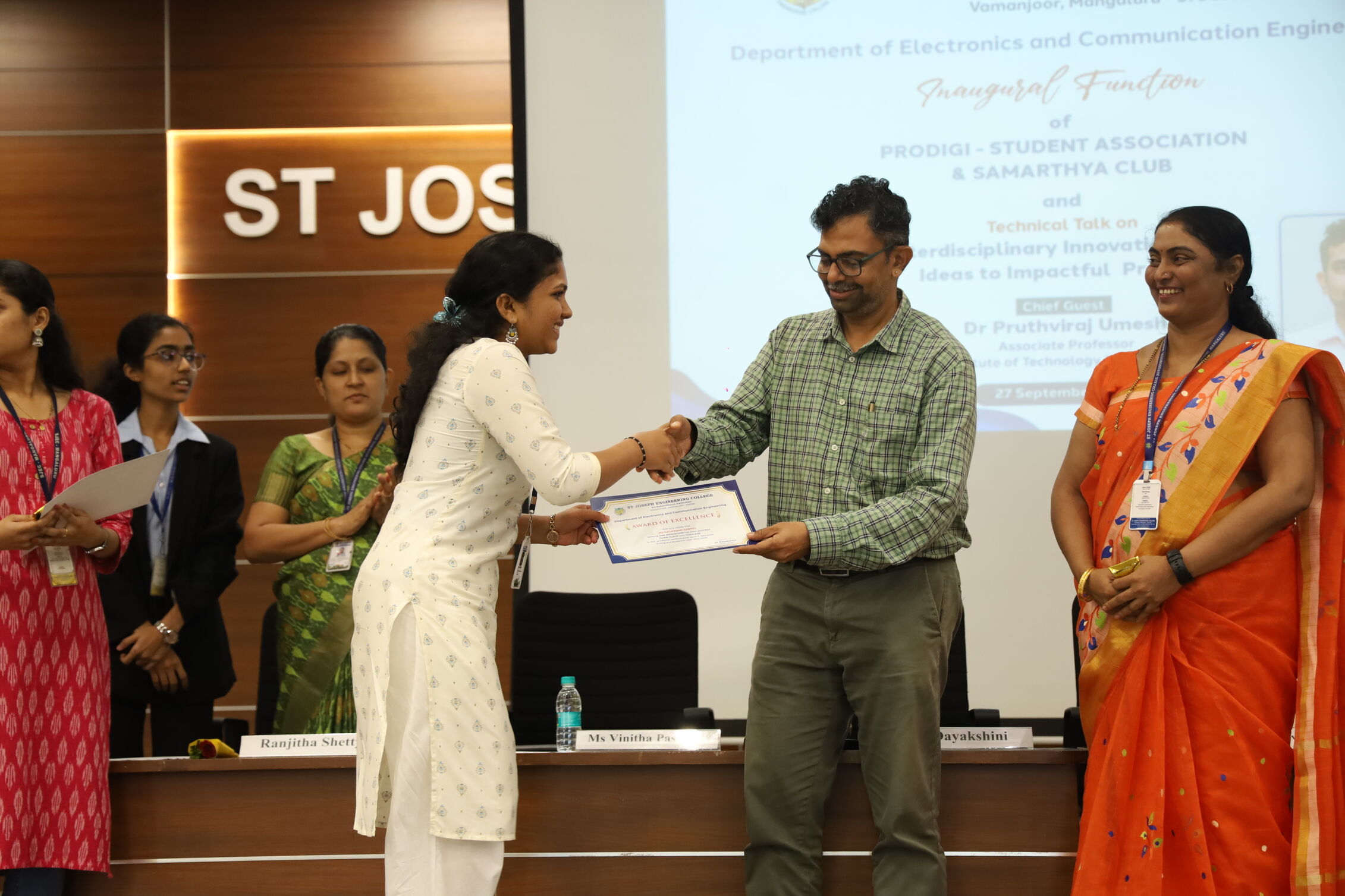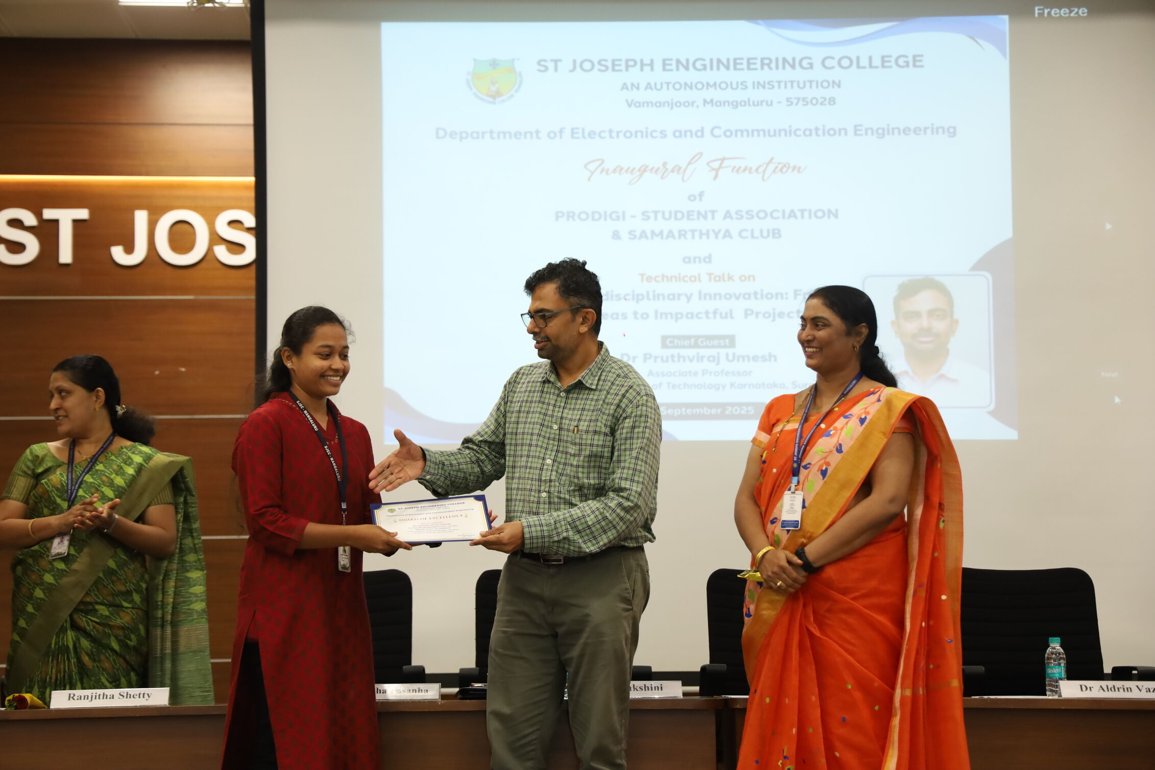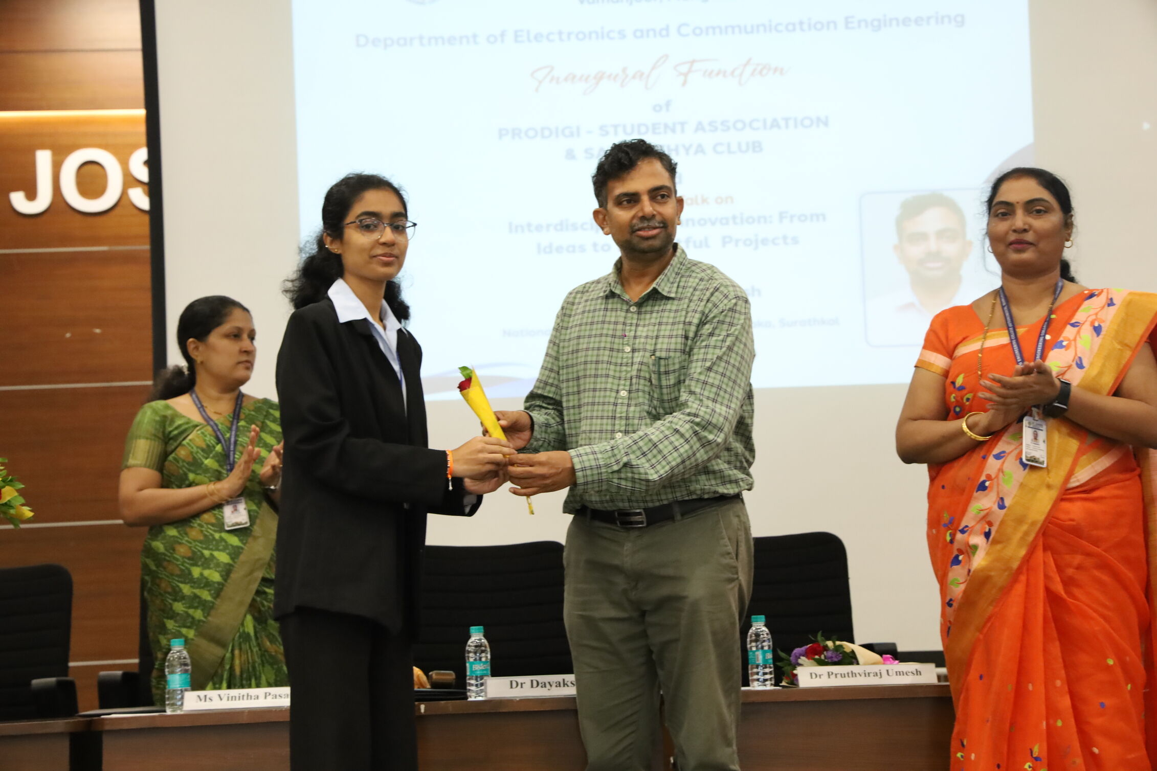 The Department of Electronics and Communication Engineering inaugurated the activities of the Prodigi Association and Samarthya Club for the academic year 2025-26 on September 27, 2025, at the Kalam Auditorium. The event, held in the presence of Dr Pruthviraj Umesh, Associate Professor, NITK, Suratkal, commenced at 11:00 AM. Dr Dayakshini, Head of the Department, welcomed the gathering and introduced the chief guest. Mr Adithya and Ms Prisha Kamalaksha Ail presented a brief report on the activities conducted during 2024-25. The new office bearers for the year 2025-26 were installed, and meritorious students were felicitated by the chief guest. Ms Ranjitha Shetty and Ms Lisha D S, Presidents of the respective associations, outlined the activities planned for the current academic year.