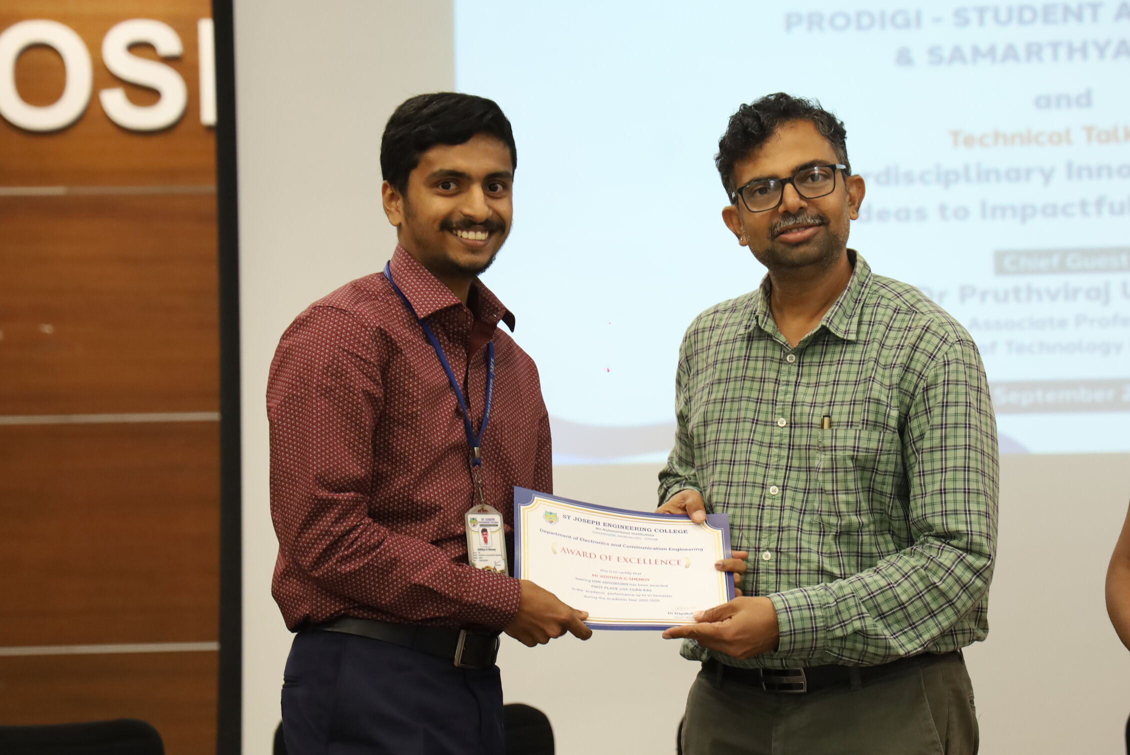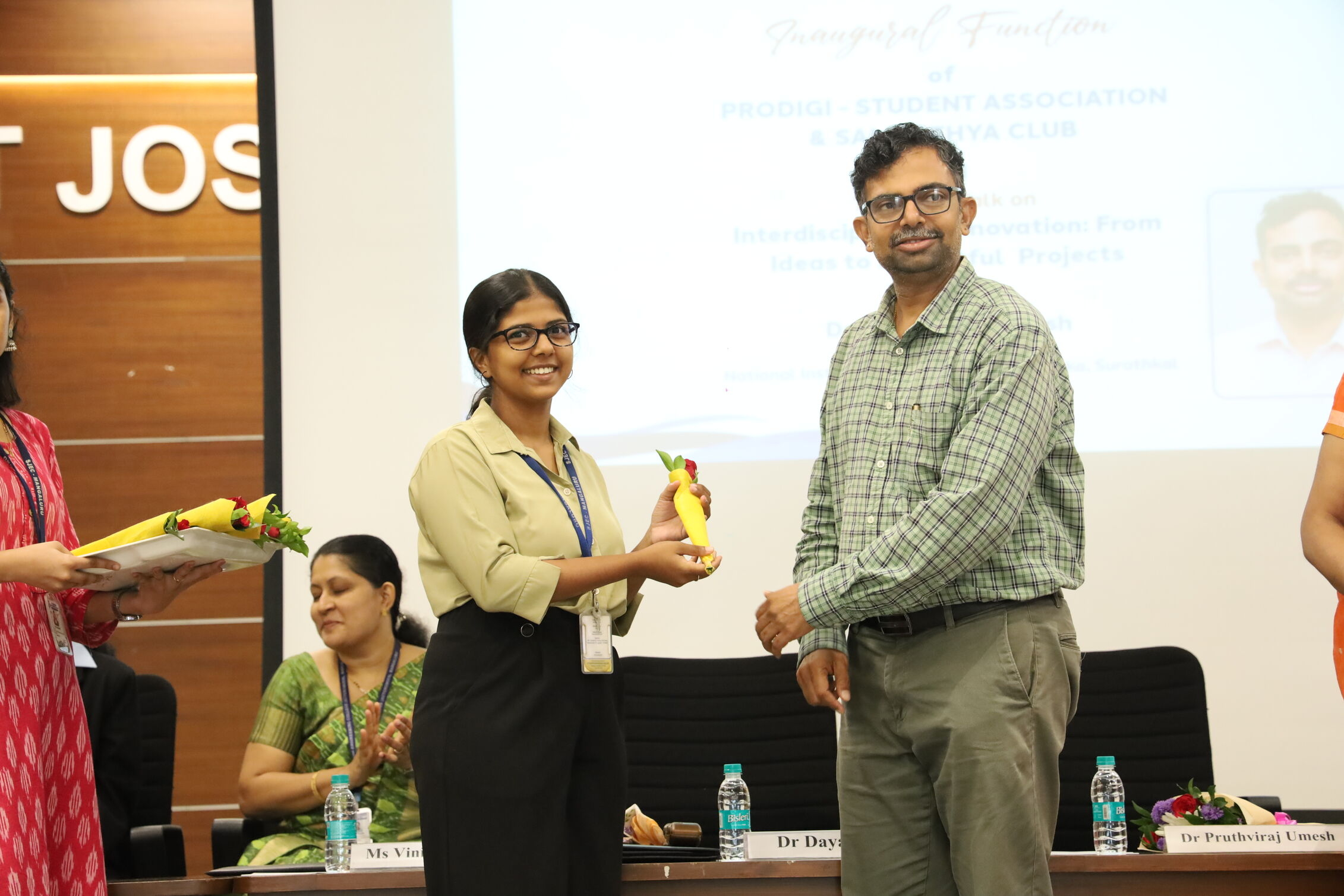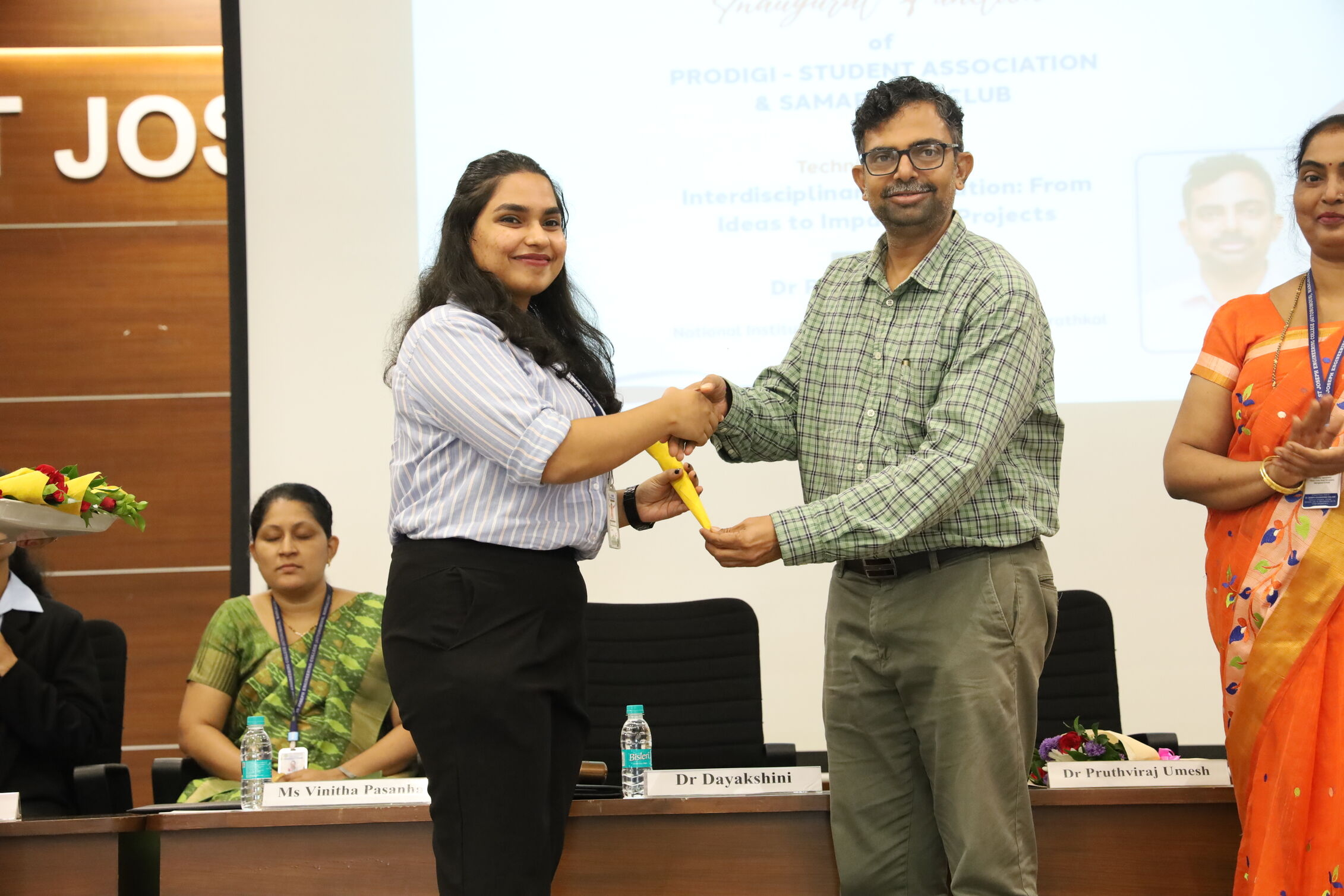 The Department of Electronics and Communication Engineering inaugurated the activities of the Prodigi Association and Samarthya Club for the academic year 2025-26 on September 27, 2025, at the Kalam Auditorium. The event, held in the presence of Dr Pruthviraj Umesh, Associate Professor, NITK, Suratkal, commenced at 11:00 AM. Dr Dayakshini, Head of the Department, welcomed the gathering and introduced the chief guest. Mr Adithya and Ms Prisha Kamalaksha Ail presented a brief report on the activities conducted during 2024-25. The new office bearers for the year 2025-26 were installed, and meritorious students were felicitated by the chief guest. Ms Ranjitha Shetty and Ms Lisha D S, Presidents of the respective associations, outlined the activities planned for the current academic year.
