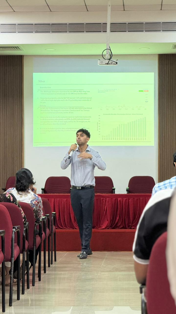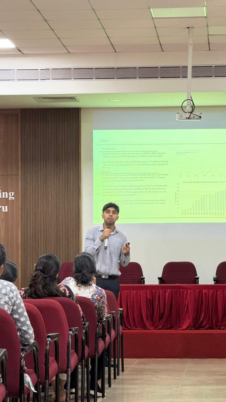 As part of the # Beyond the Border Series, the Department of Business Administration, SJEC organised an invited lecture on ‘Global Financial Markets: An Overview’ by Mr. Ashlyn Rohit Castelino on 02 January 2026 for SJEC MBA students. Mr. Ashleyn Rohit Castelino, is currently pursuing his Master’s in Business Analytics at the University of Illinois Urbana-Champaign (UIUC), USA. He actively engages himself in equity research and AI consulting, combining financial analysis with technical problem-solving, and has led multiple student organizations focused on investing, technology, and professional development. His interests lie in building scalable technology products, applying data and AI to real-world problems, and operating at the intersection of markets, strategy, and innovation.