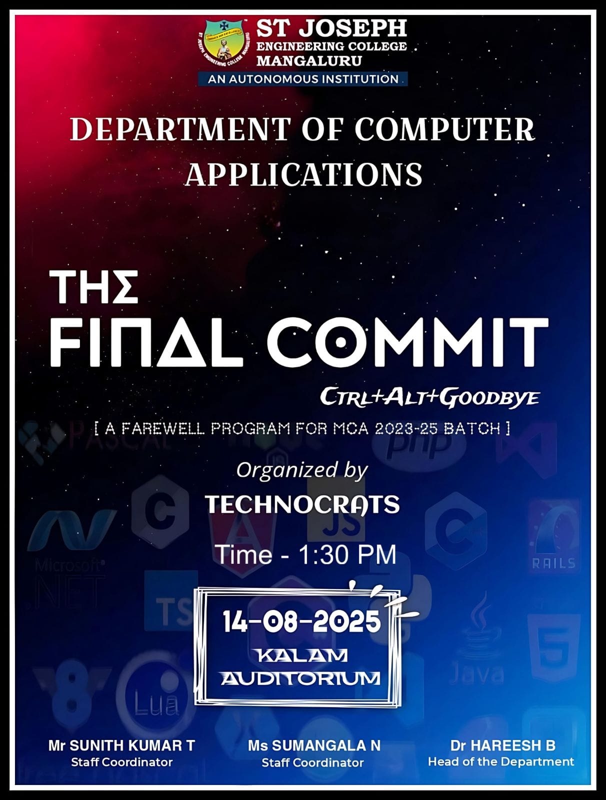 The Department of Master of Computer Applications (MCA) organized a heartfelt Farewell Program for the outgoing students of Batch 2023–2025 on Thursday, 14th August 2025, at the Kalam Auditorium. The event was organized to bid farewell to the graduating students and to celebrate their memorable journey in the department.