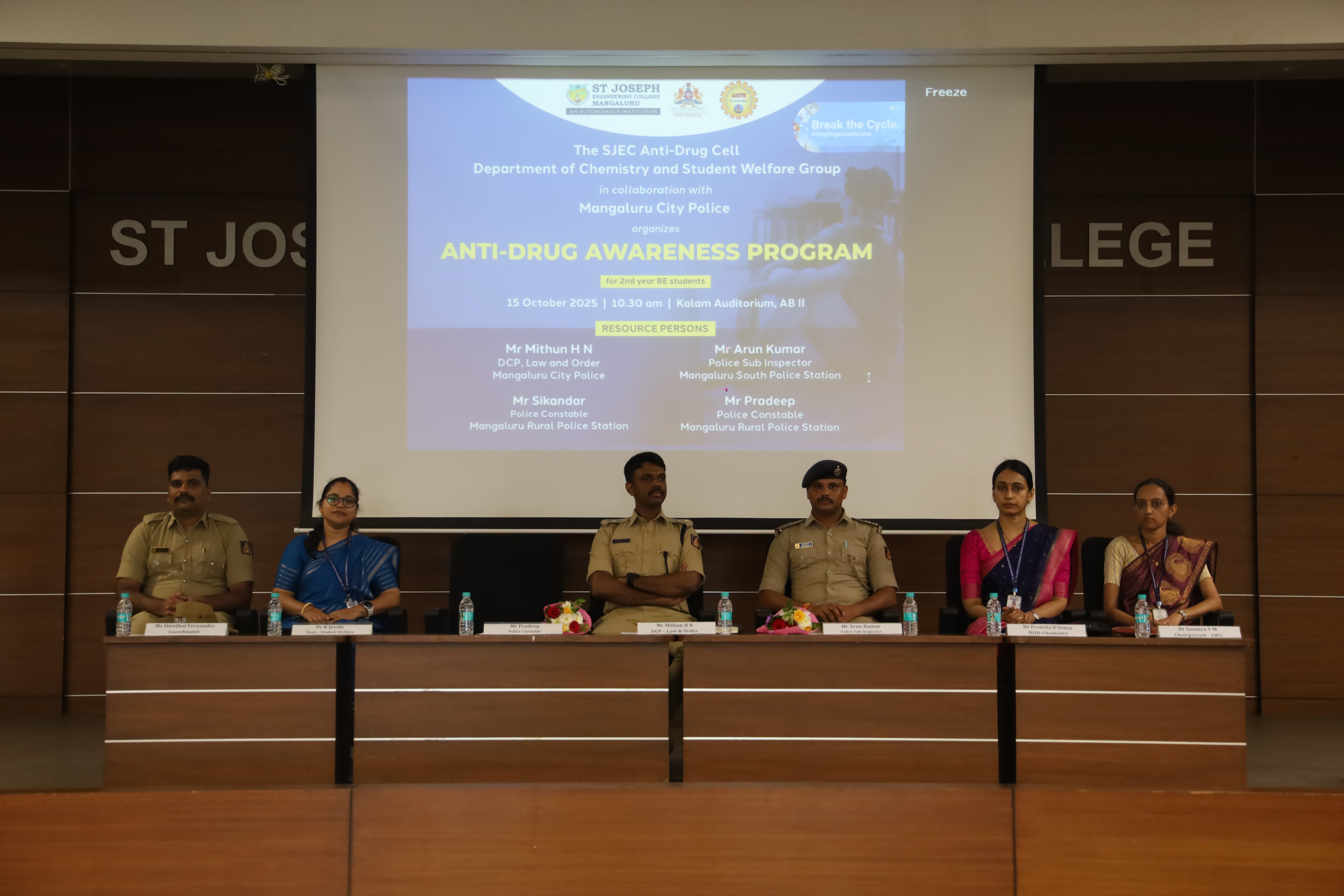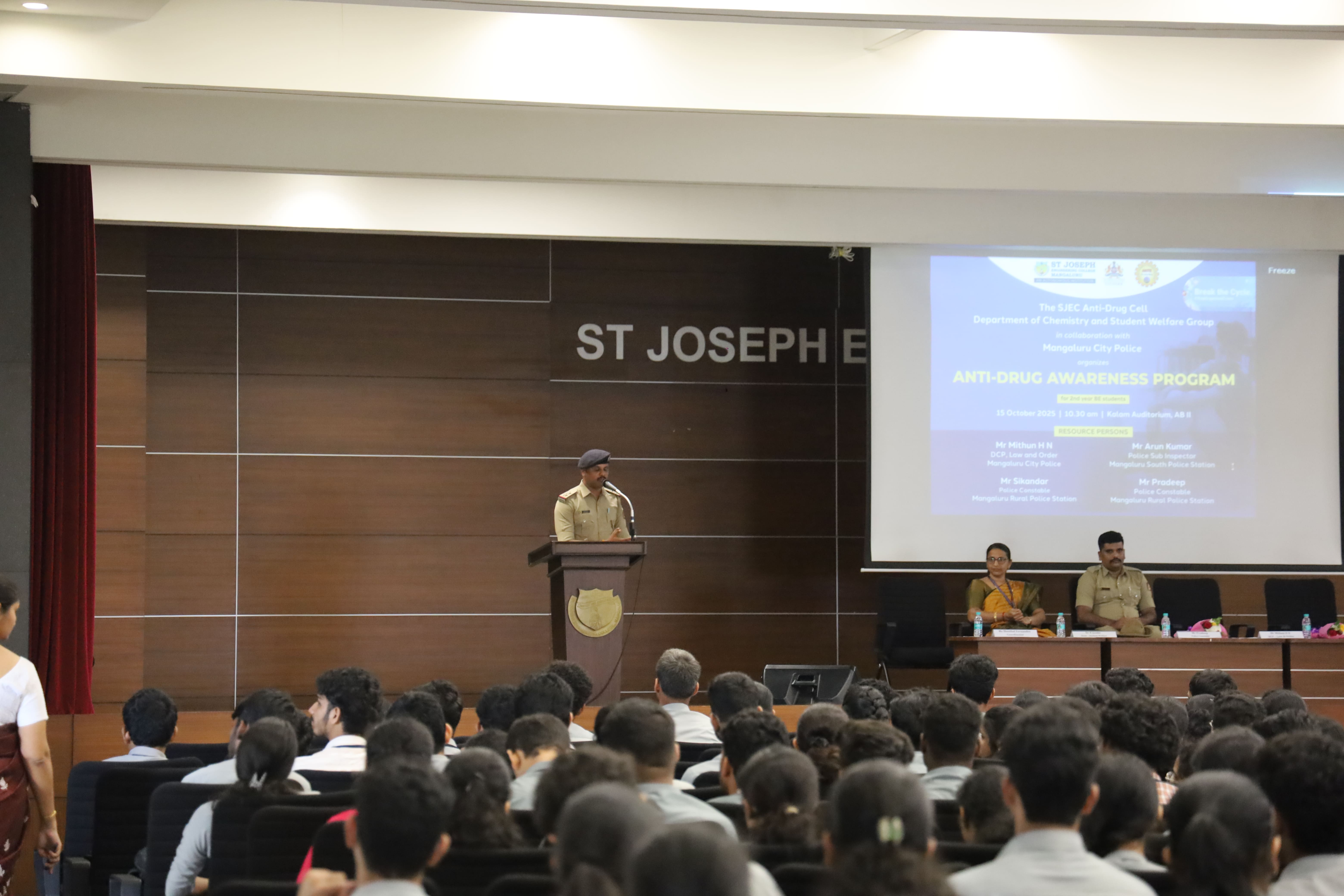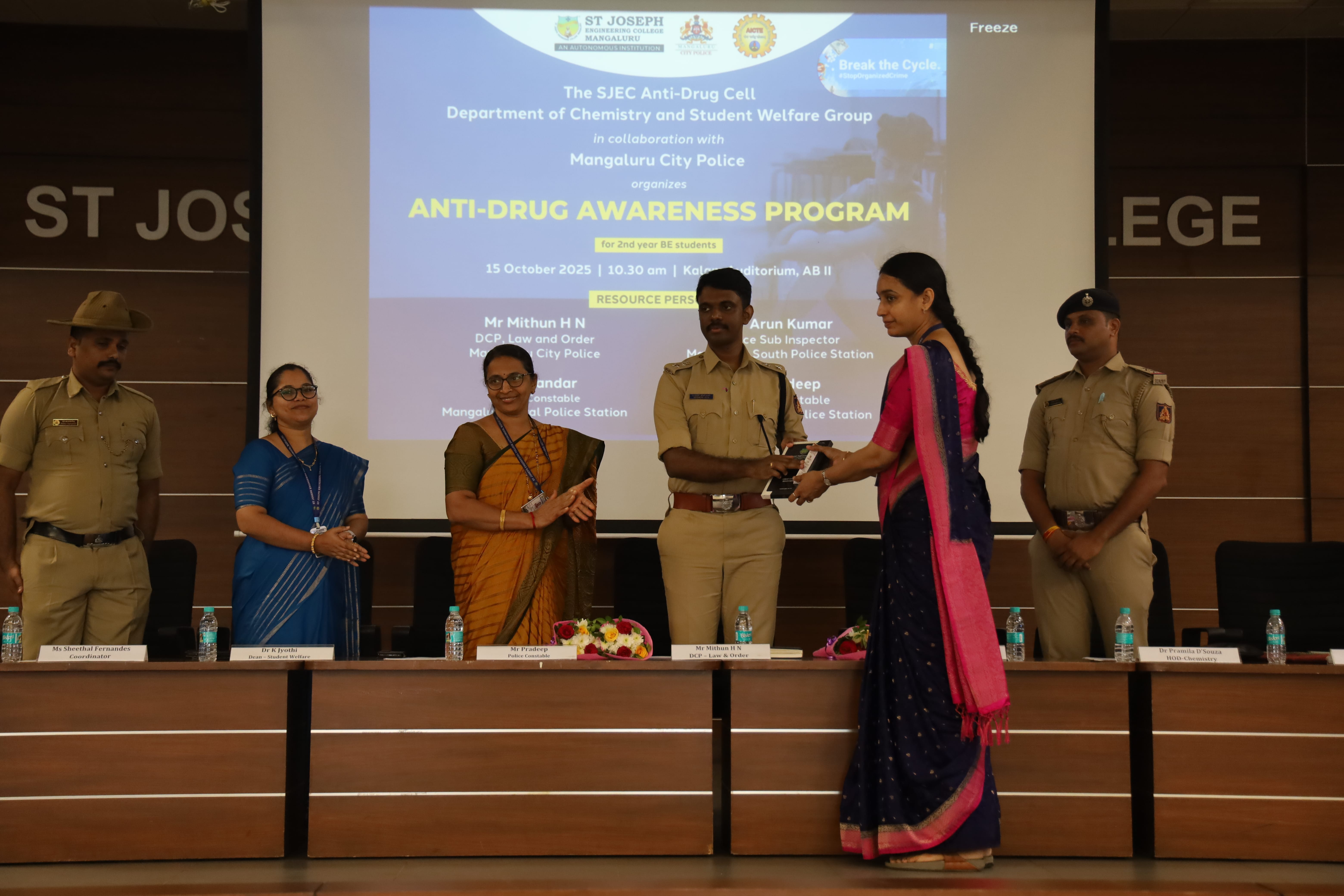 The SJEC Anti-Drug Cell, Department of Chemistry, Student Welfare Group of St. Joseph Engineering College (SJEC) in collaboration with Mangaluru City Police, organized an Anti-Drug Awareness Program for 2nd Year BE students of SJEC on Wednesday, 15 October 2025, at 10:30 am in the Kalam Auditorium.