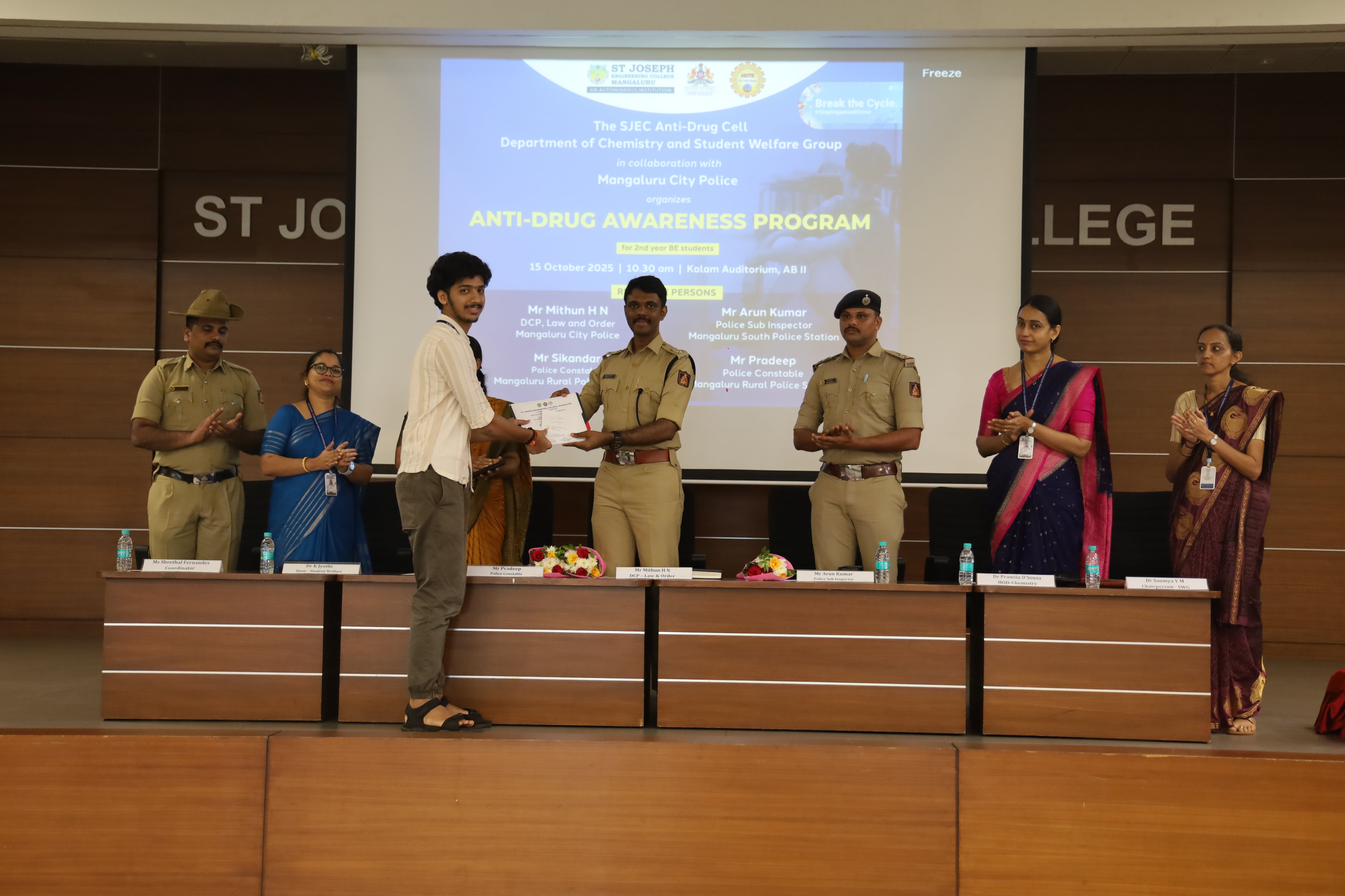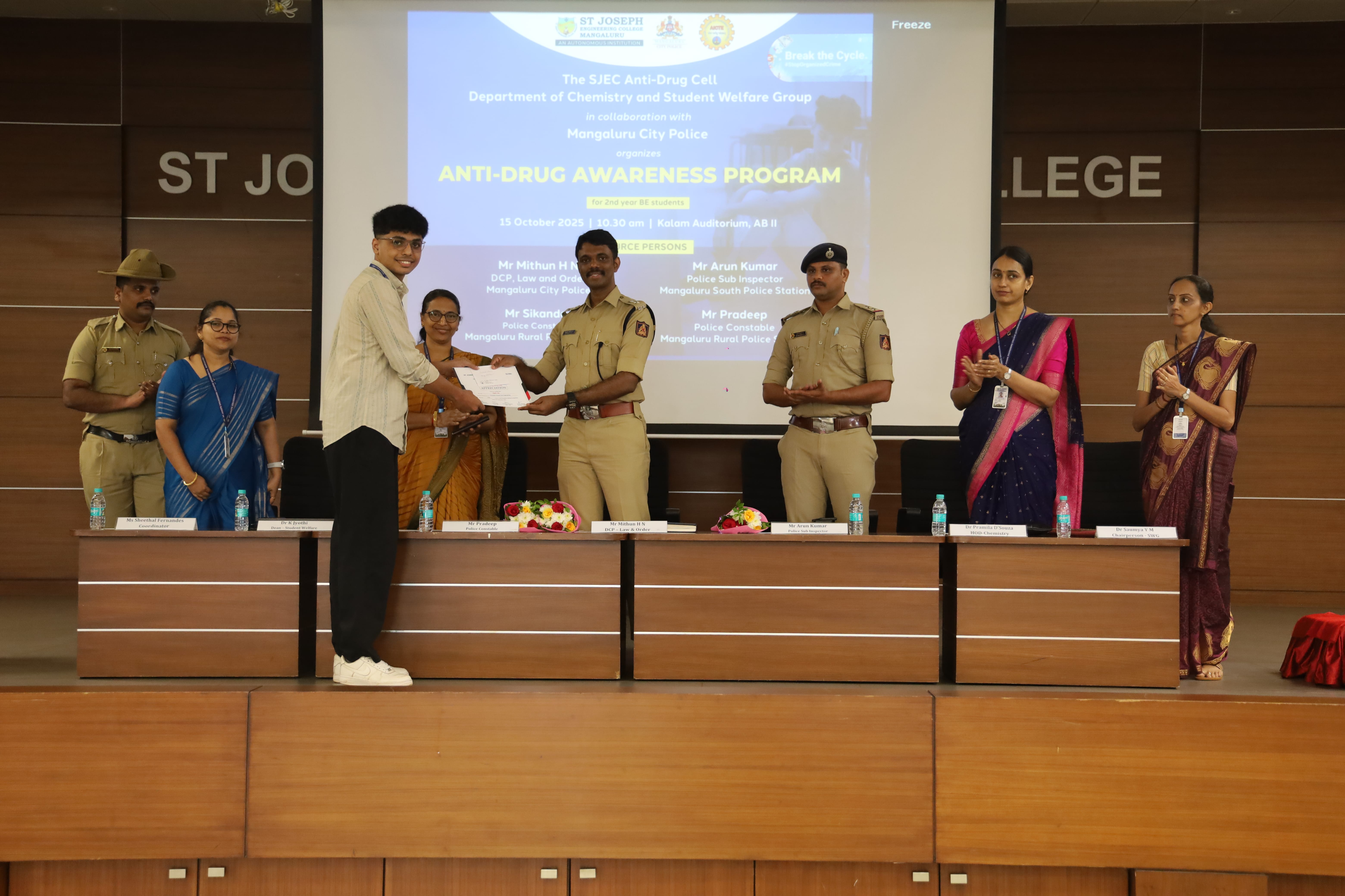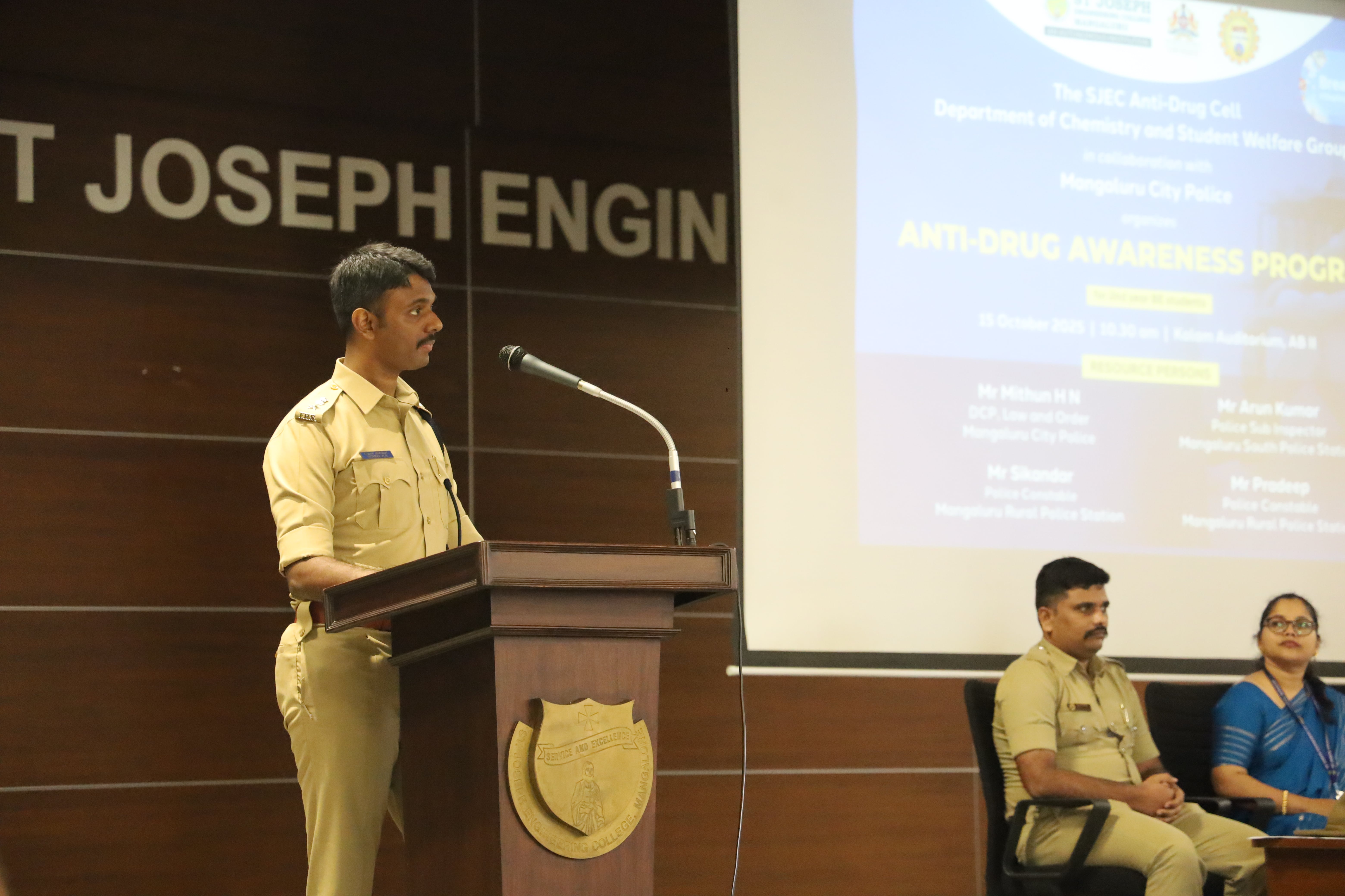 The SJEC Anti-Drug Cell, Department of Chemistry, Student Welfare Group of St. Joseph Engineering College (SJEC) in collaboration with Mangaluru City Police, organized an Anti-Drug Awareness Program for 2nd Year BE students of SJEC on Wednesday, 15 October 2025, at 10:30 am in the Kalam Auditorium.