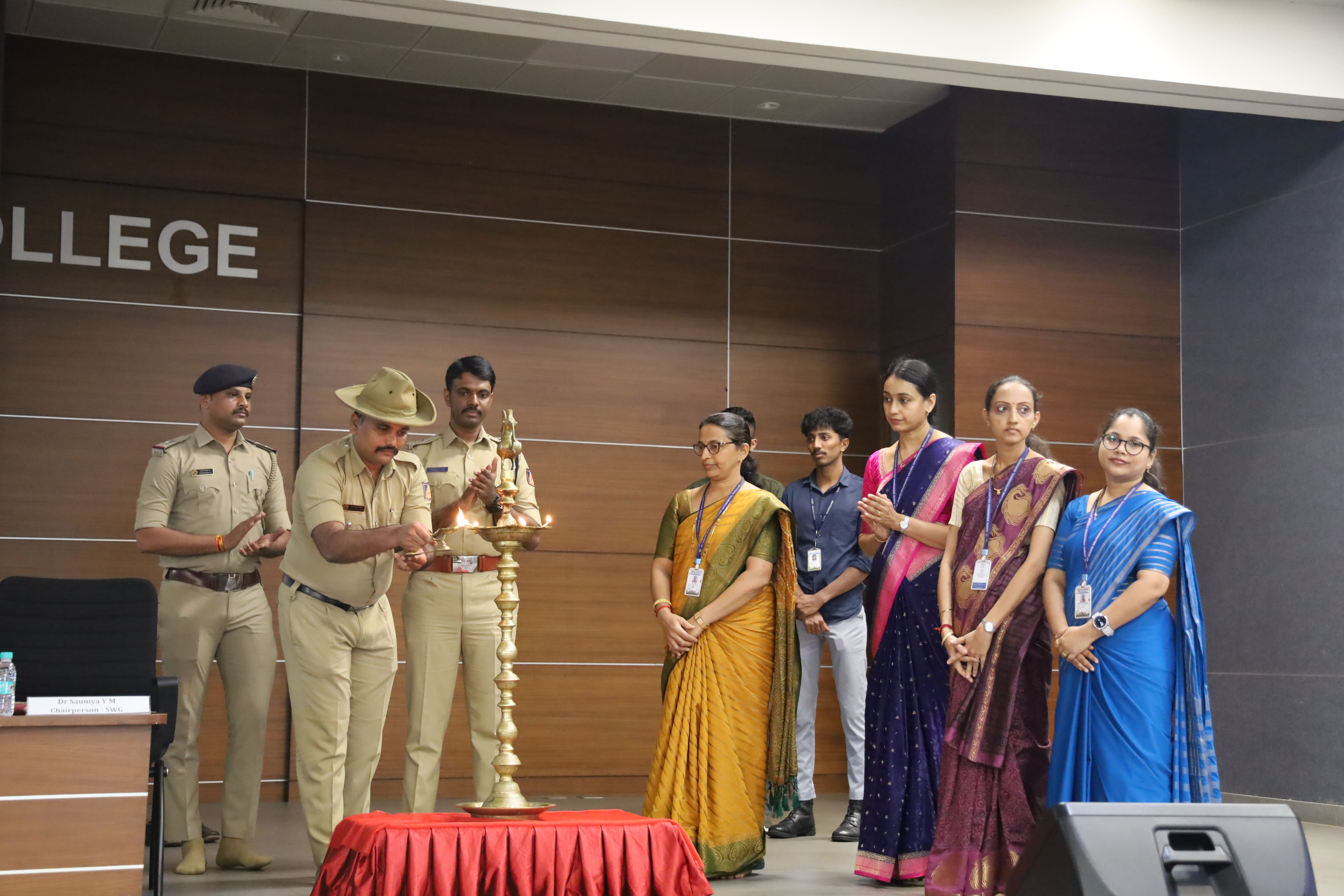 The programme commenced with an invocation. Dr. K. Jyothi, Dean – Student Welfare, warmly welcomed the dignitaries and the gathering. In her address, she emphasized that the objective of the programme was to create awareness about the dangers of substance abuse and to empower students to make informed and wise choices — guided by knowledge, courage, and conviction — to contribute towards building a drug-free society. The dignitaries on the dais formally inaugurated the programme by lighting the ceremonial lamp.