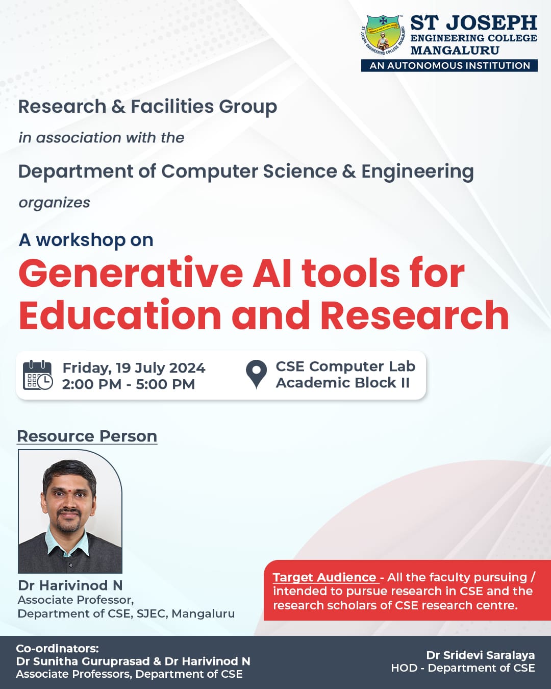 Research & Facilities Group in association with the Department of Computer Science & Engineering organized a workshop on “Generative AI tools for Research”, on 19th July 2024, Dr Harivinod N Associate Professor, CSE were the resource persons 17 staff participated in the workshop.