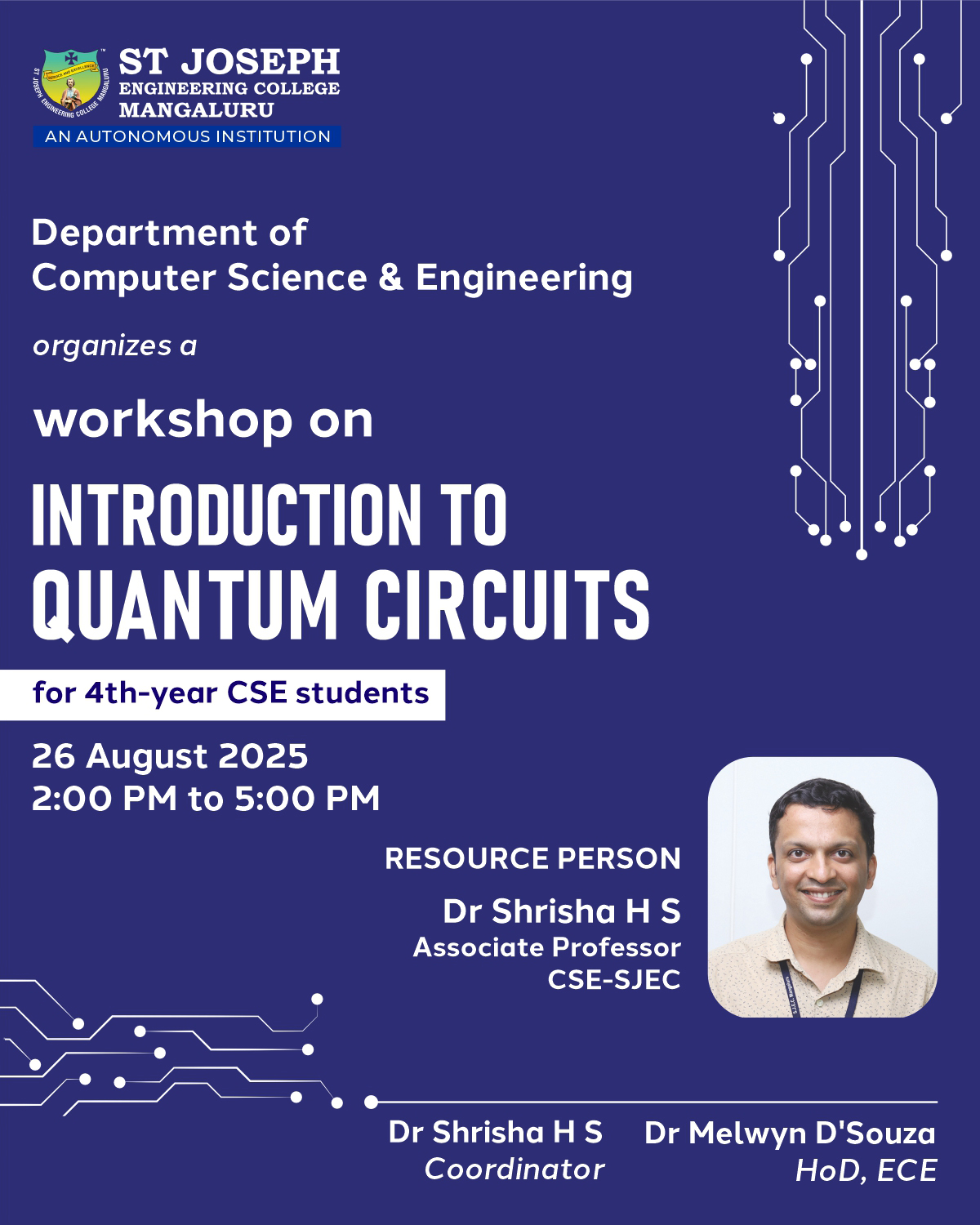 Department of Computer Science and Engineering organized a workshop on “Introduction to Quantum Circuits” on 26 Aug 2025. For CSE final year students and staff. Dr Shrisha H.S was the resource person. 9 Staff and 11 students attended the workshop.