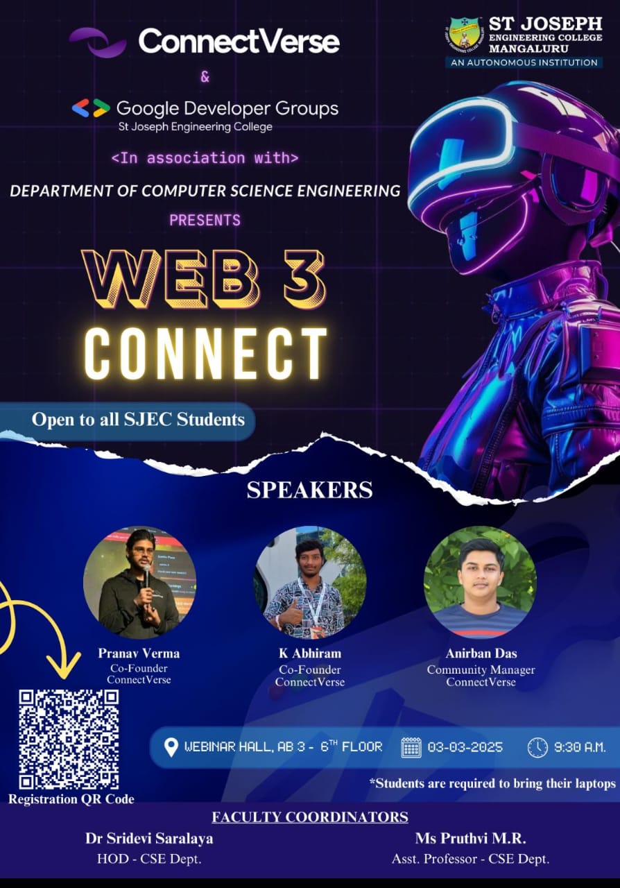 Department of Computer Science & Engineering in association with GDG- Google Devgeloper group organized a workshop on “WEB 3 Connect on 03 March 2025, for SJEC students. Mr. Pranav Varma, Co-founder @ConnectVerse, K. Abhiram, Software Engineer at HCLTech, Mr. Anirban Das Co-founder @ Connect Verse served as resource persons for the event. 87 students attended the workshop.