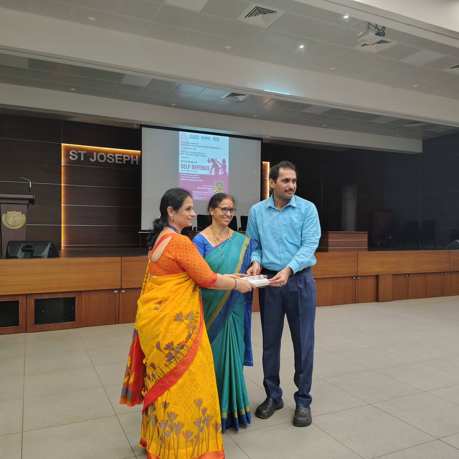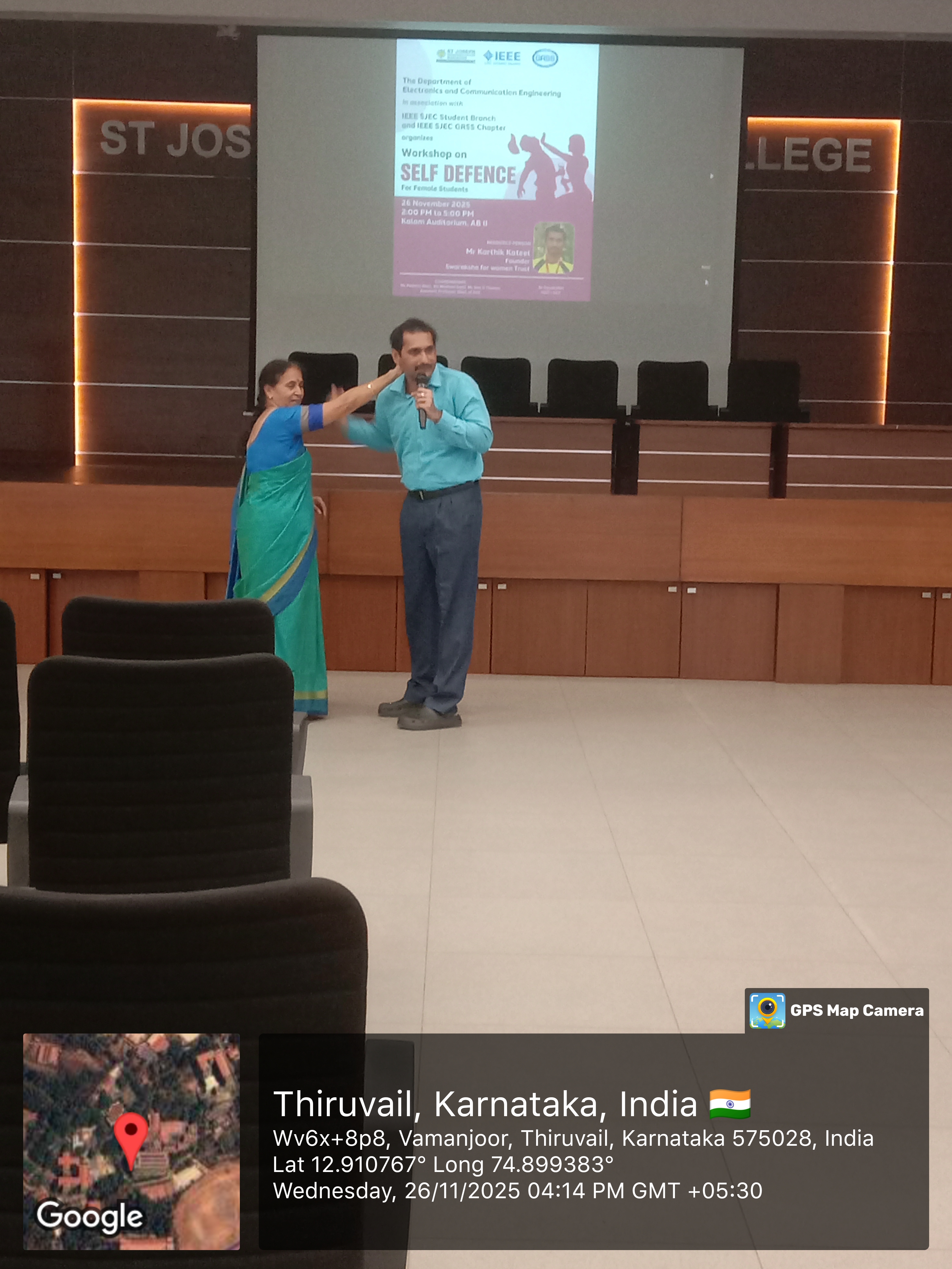 The Department of Electronics and Communication Engineering, in association with the IEEE SJEC Student Chapter and the IEEE GRSS Branch, organized a workshop on Self-Defence for Women Students on 26 November 2025 at the Kalam Auditorium. The session aimed to empower students with essential self-defence skills and awareness on personal safety. The workshop was coordinated by Ms Padmini Bhat, Ms Madhavi Gatty and Ms Simi Thomas- Assistant Professors, Department of ECE.