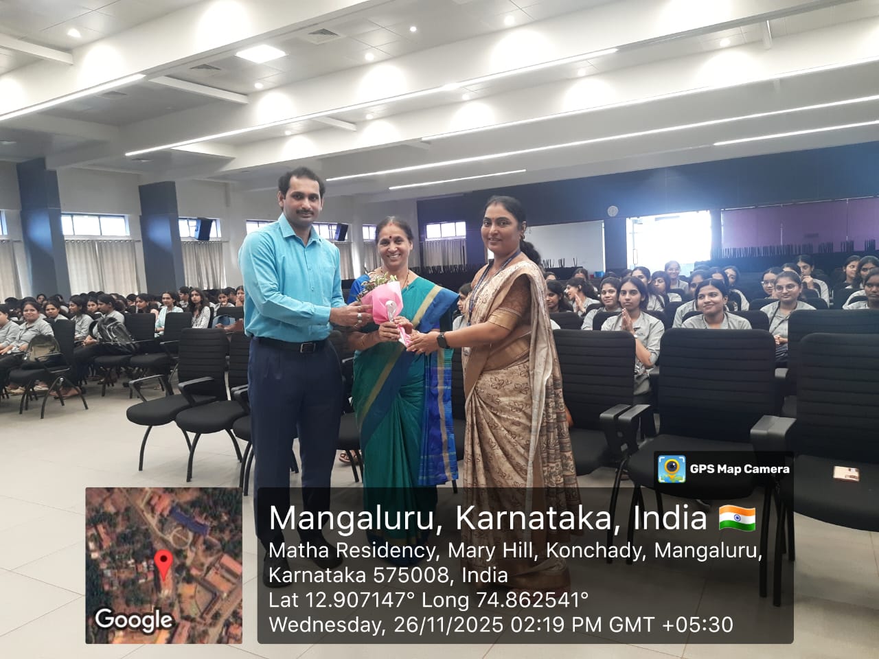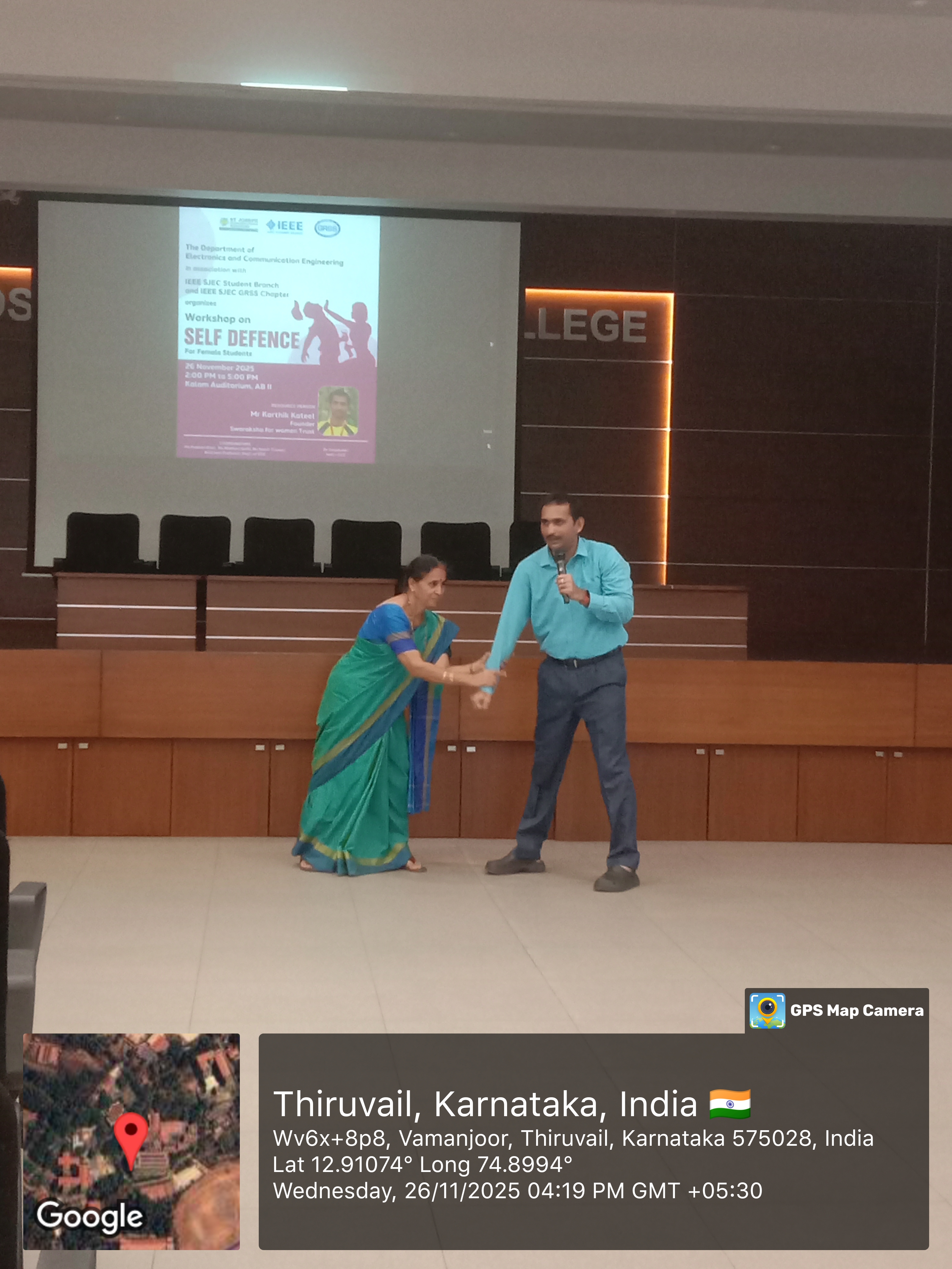 The workshop was conducted by Mr. Karthik Kateel, a renowned self-defence trainer, who served as the resource person for the event. The session began with Ms. Padmini Bhat introducing the resource person to the audience, followed by a warm welcome and bouquet presentation by Dr. Dayakshini, Head of the Department of Electronics and Communication Engineering.