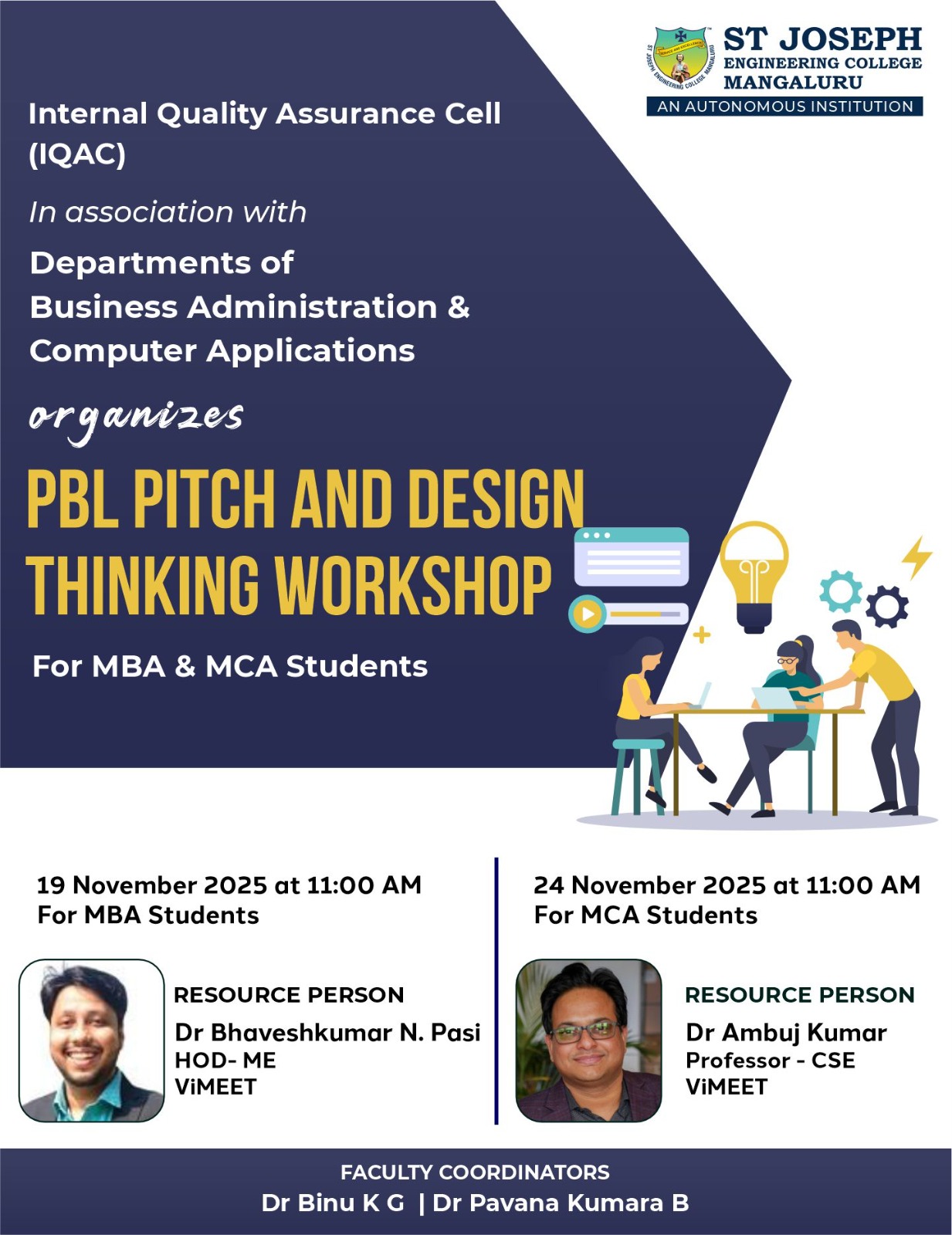 The Department of Business Administration conducted the PBL Pitch and Design Thinking Workshop for MBA students on 19 November 2025 at 11:00 AM, in collaboration with IQAC and the Department of Computer Applications. The workshop was designed to expose students to structured innovation techniques and guide them in transforming business challenges into actionable solutions. The resource person led the participants through various stages of design thinking empathy, problem definition, ideation, prototyping, and testing using relatable business scenarios and practical illustrations. Students were encouraged to work in teams, brainstorm creatively, and justify their ideas with logical reasoning and user-focused insights. The workshop also emphasized the importance of effective pitching, helping students understand how to communicate their ideas with clarity, confidence, and impact. Through interactive tasks, discussions, and real-time feedback, the session helped MBA students develop a deeper appreciation for experiential learning and its relevance in modern management education. It also equipped them with skills that support critical thinking, decision-making, collaboration, and innovative mindset formation. The program received positive feedback from students for its engaging format, and the efforts of faculty coordinators Mr Roopesh and Dr Shakila B along with the conveners Dr. Binu K G and Dr. Pavana Kumara B ensured the smooth organization and overall success of the workshop.