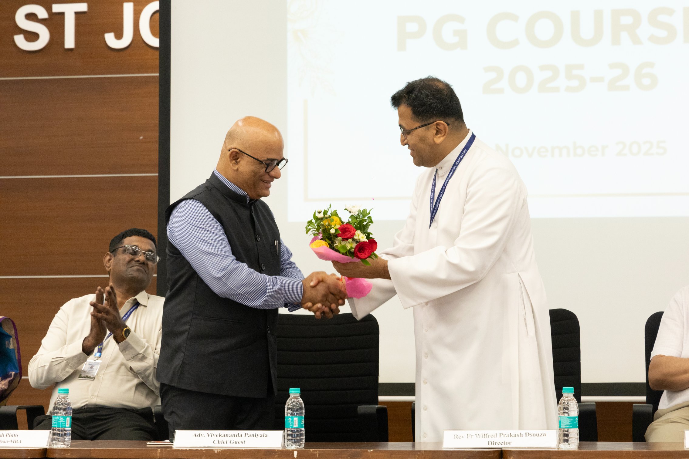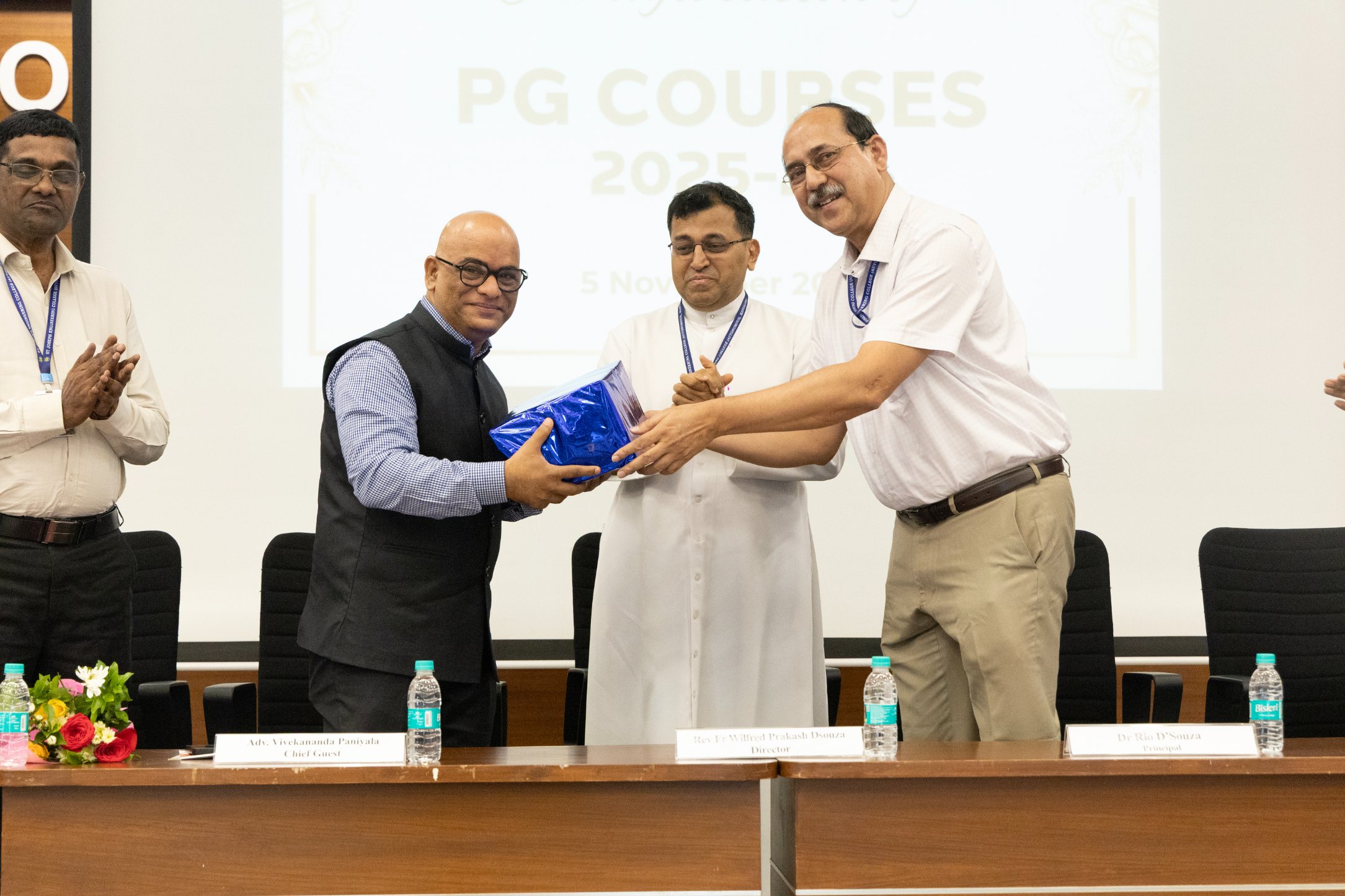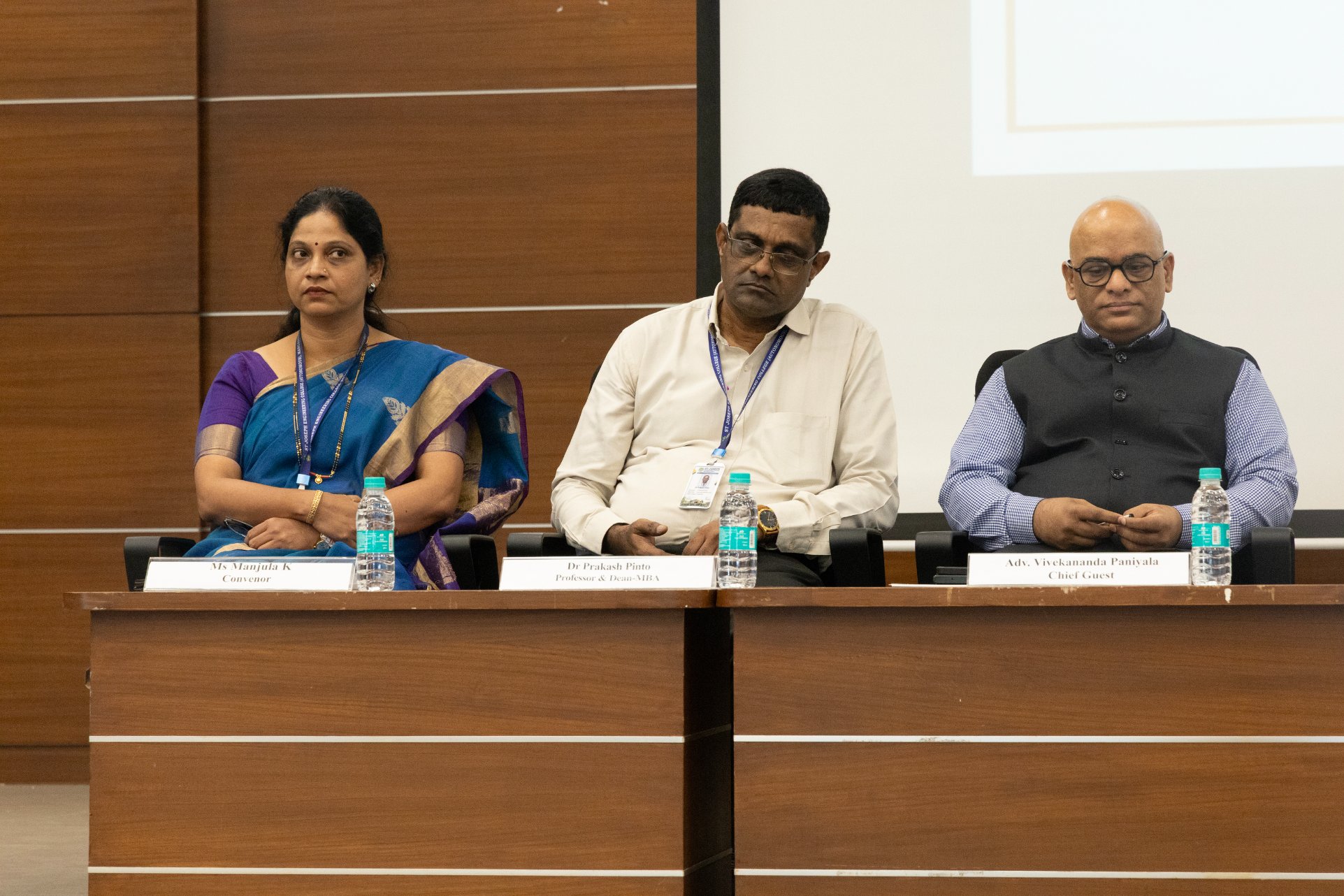 Adv. Vivekananda Paniyala, in his inaugural speech inspired the gathering by sharing his experiences, highlighting that management lessons begin at home and the institution itself is a model for future managers. Through his experience, he noted that successful corporate leaders have three things in common, those are justice, clarity, and commitment, and urged students to learn humbly from their teachers while exploring life beyond academics. He also encouraged legal awareness among MBA and MCA students, suggesting a short-term courses on IPR, confidentiality, POSH, and cyber defamation.