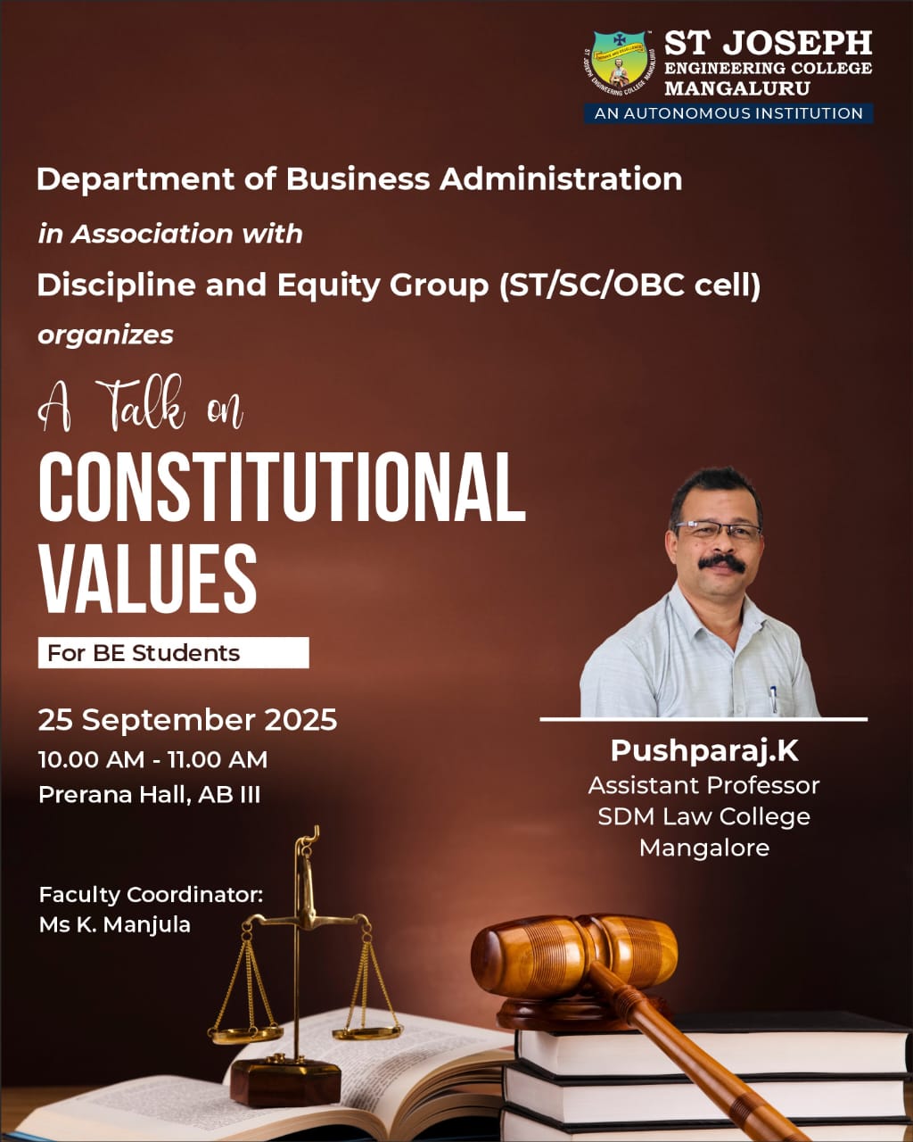 The Department of Business Administration, in collaboration with the Discipline and Equity Group of St Joseph Engineering College (SJEC), organized a talk on “Constitutional Values” for the B.E. students on 25th September 2025.
