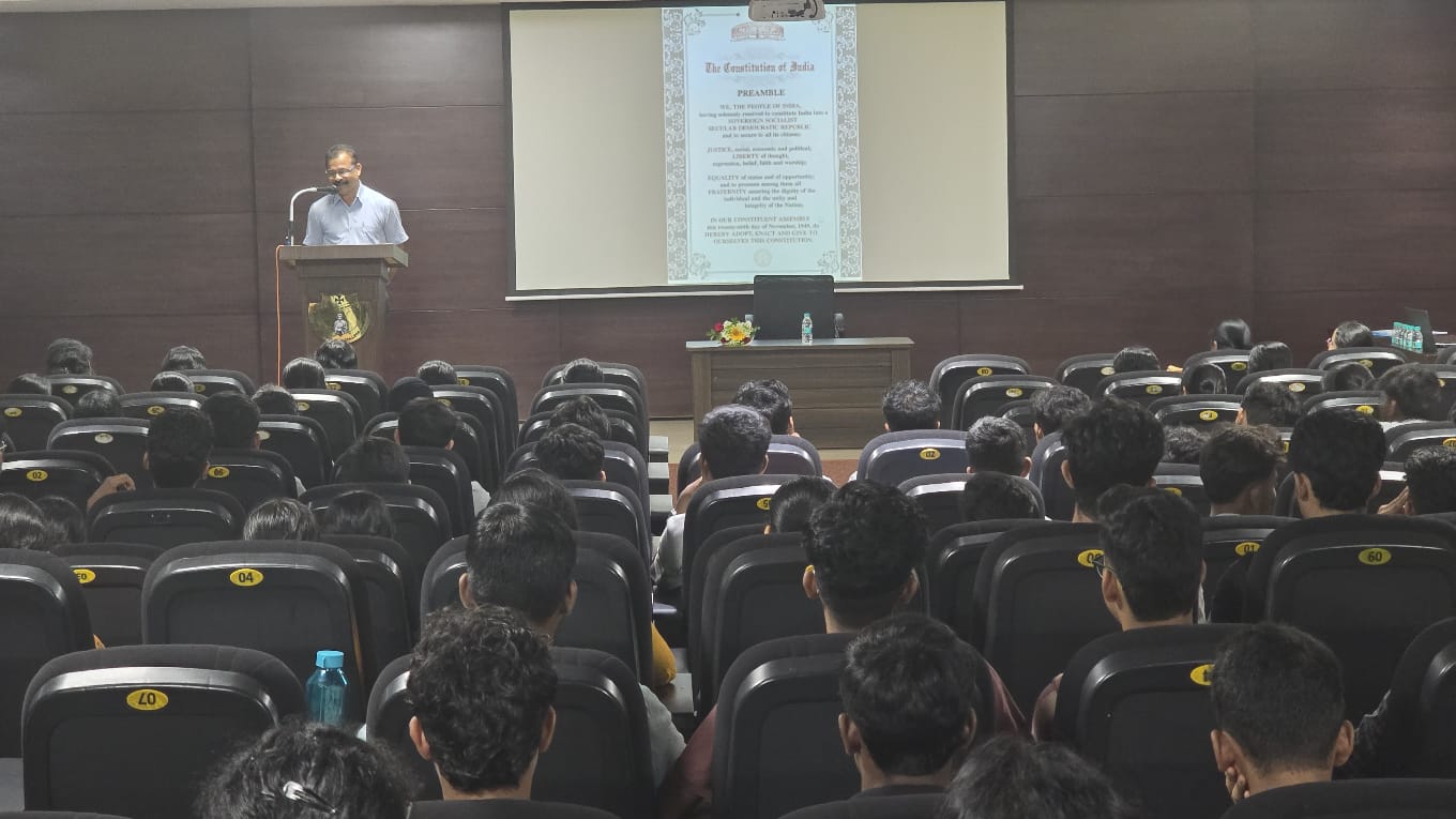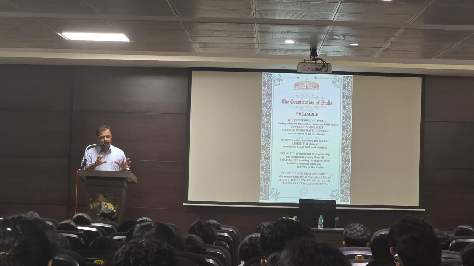 Further, he elaborated on the Preamble of the Indian Constitution, explaining in detail the concepts of Sovereignty, Socialism, Secularism, Democracy, Republic, and other guiding principles, supported by relevant examples. His address offered students a deeper understanding of the values enshrined in the Constitution and their significance in nation-building.