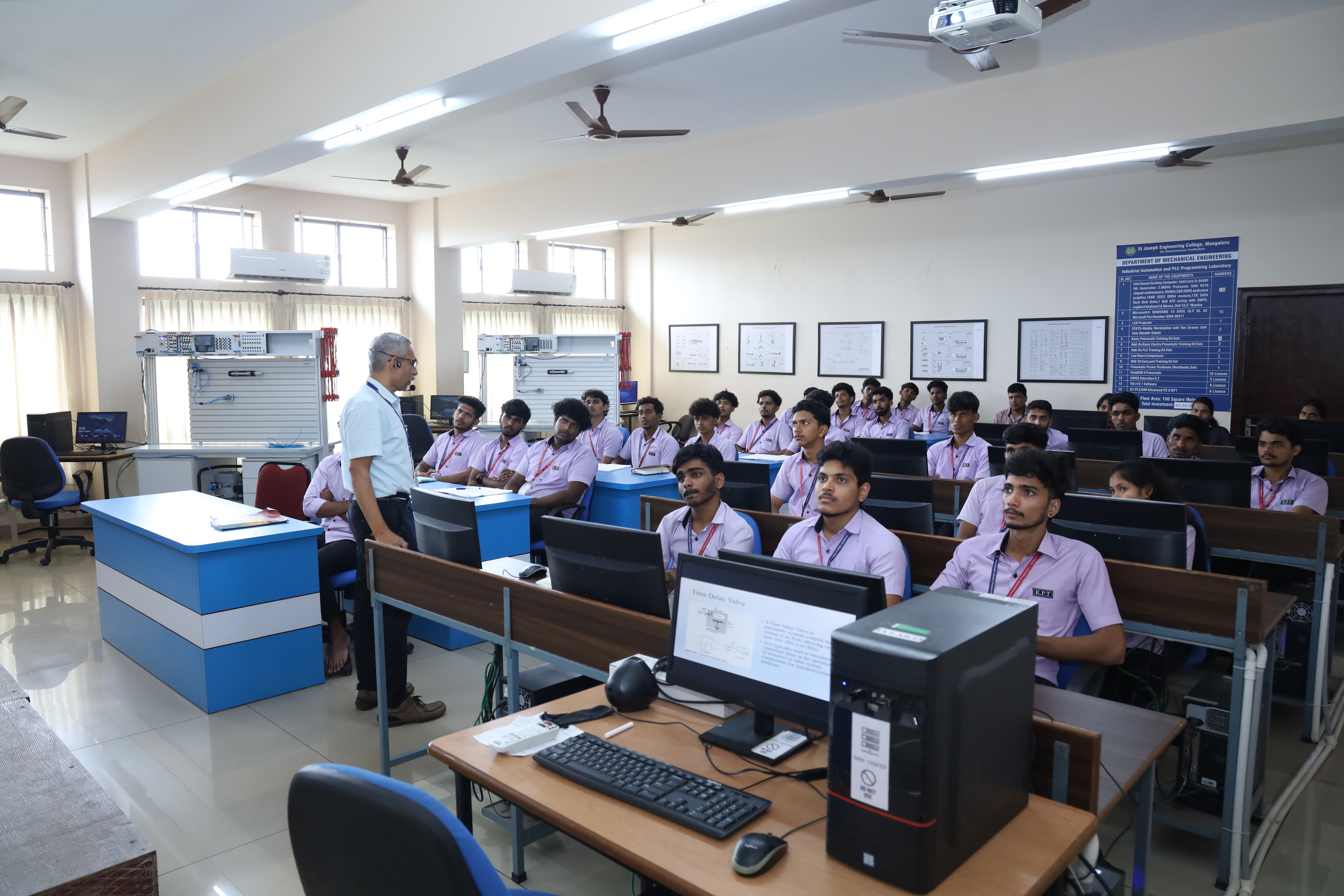 Day 1 introduced participants to the Fundamentals of Hydraulics and Automation. Sessions by Mr. Joel D’mello covered principles, system structures, and industrial applications of hydraulics. Mr. Prathviraj H & Mr. Prashanth Kumar guided students in hydraulic circuit design, while Mr. Rajesh Belchada & Dr. Sushanth H. G demonstrated pneumatic circuit visualization using FluidSIM 5. The day ended with a hands-on demo of FESTO Workbench by Dr. Swaraj D. Lewis & Mr. Belchada.