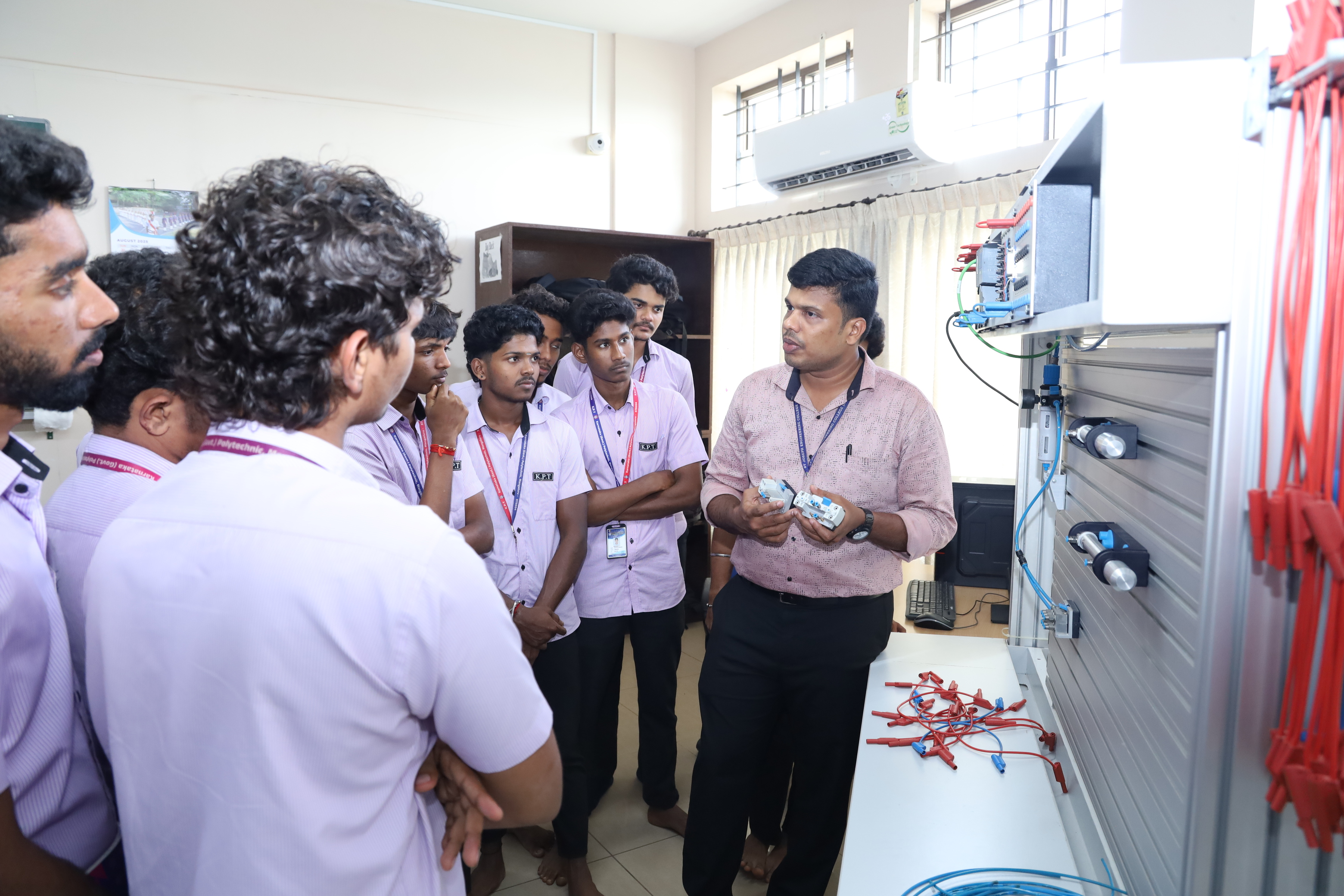 Day 2 focused on Pneumatics and Electro-pneumatics. Mr. Prashanth Kumar & Mr. Prathviraj explained system components, compressors, FRL units, and actuators, followed by practical pneumatics sessions led by Dr. Lewis & Dr. Sushanth. Afternoon sessions introduced Electro-pneumatics, integrating electrical controls with pneumatic systems, with live demonstrations.