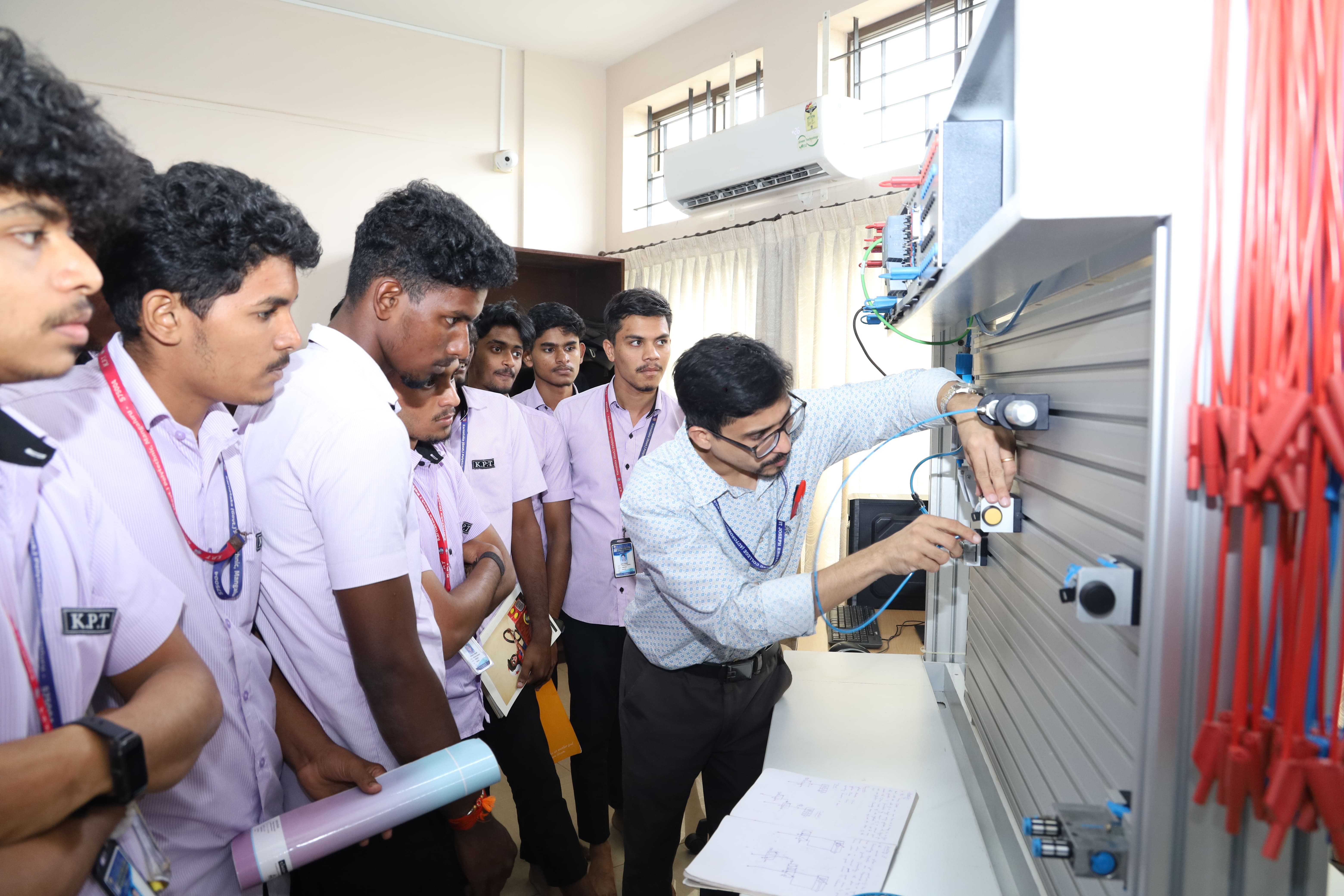 Second day focused on Pneumatics and Electro-pneumatics. Students explored system components, compressors, FRL units, and actuators. Practical sessions were conducted by Dr. Lewis and Dr. Sushanth, while afternoon demonstrations introduced electro-pneumatics with live integration of electrical controls.
