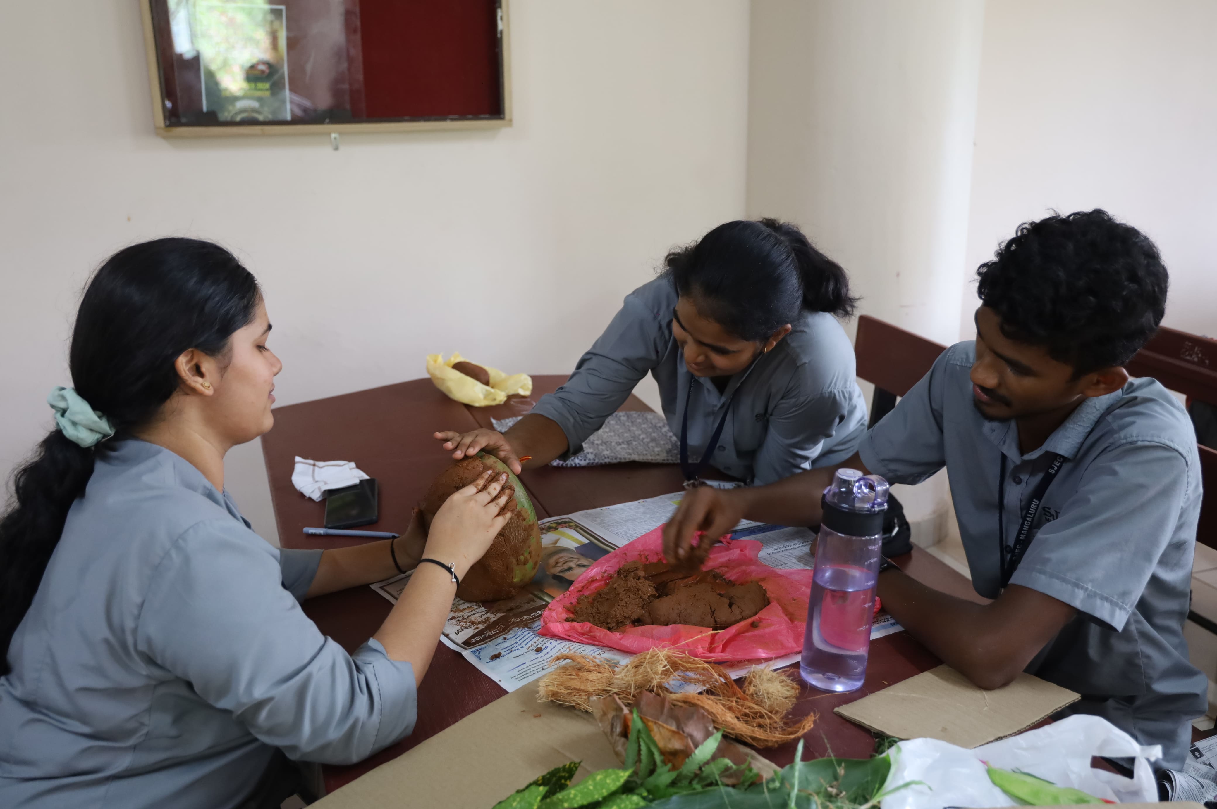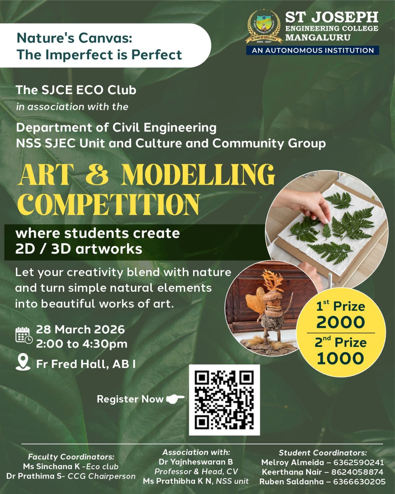 The SJCE ECO Club, in collaboration with the Department of Civil Engineering, NSS SJEC Unit, and the Cultural and Community Group (CCG), organized an Art & Modelling Competition titled “Nature’s Canvas: The Imperfect is Perfect” on 28 March 2026 from 2:00 PM to 4:30 PM in Classroom No. 2204. The event aimed to promote eco-conscious creativity by encouraging students to create 2D and 3D artworks using natural and biodegradable materials such as leaves, flowers etc. Participants showcased innovative ideas reflecting themes like environmental conservation, water preservation, and harmony with nature. The competition witnessed enthusiastic participation, highlighting both artistic talent and environmental awareness among students. The first place was shared by two teams—Team #NC1009 (Ayesha Shama and Anit Fernandes) and Team #NC1012 (Deeksha Moger, Blessida Pinto, Chris Monteiro, and Aron Correa)—while the second place (#NC1006) was awarded to B R Rashmi, Kushi A S, Prajna D, and A Avani. The event successfully blended creativity with sustainability, reinforcing the importance of protecting the environment through artistic expression.