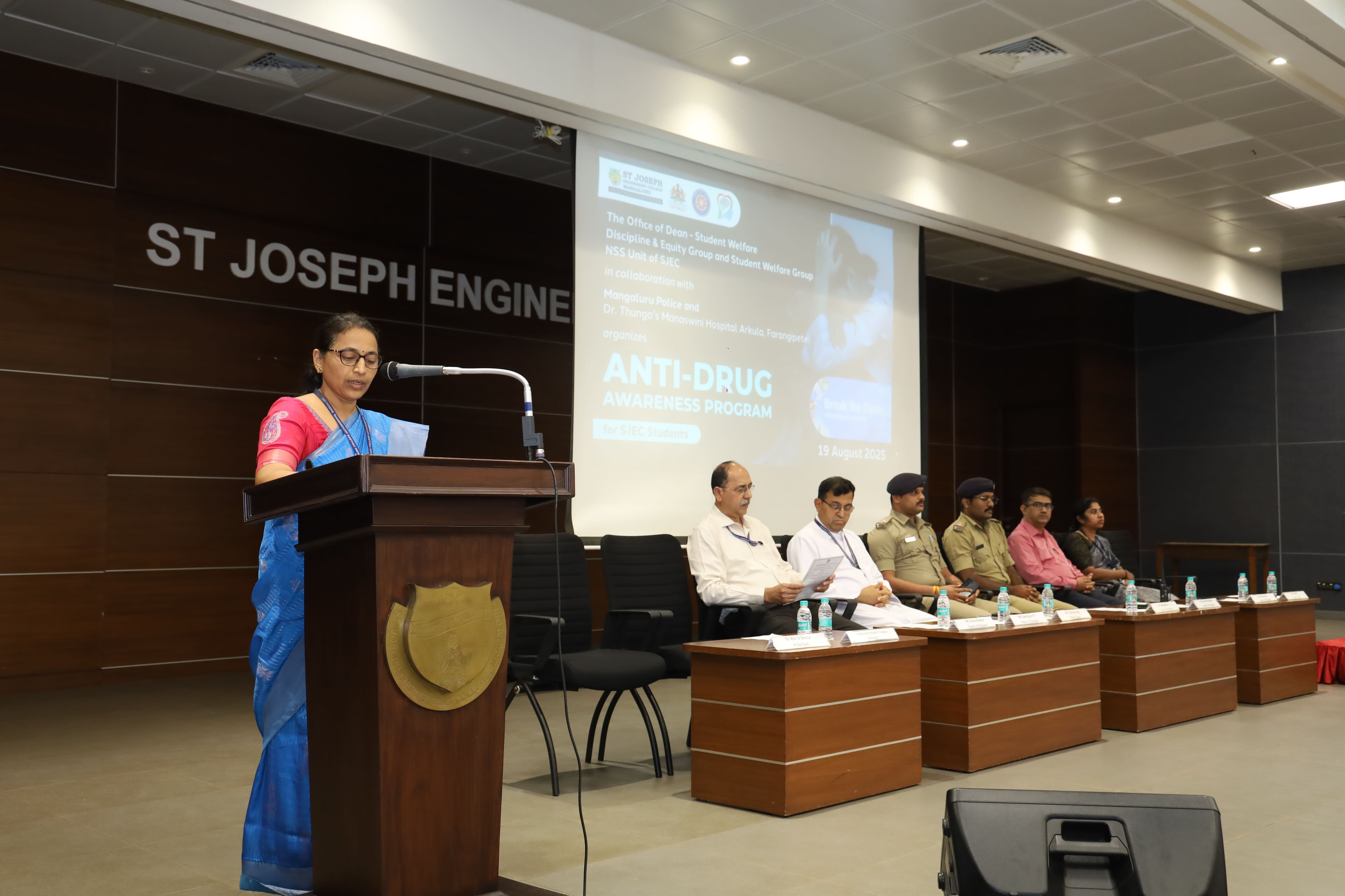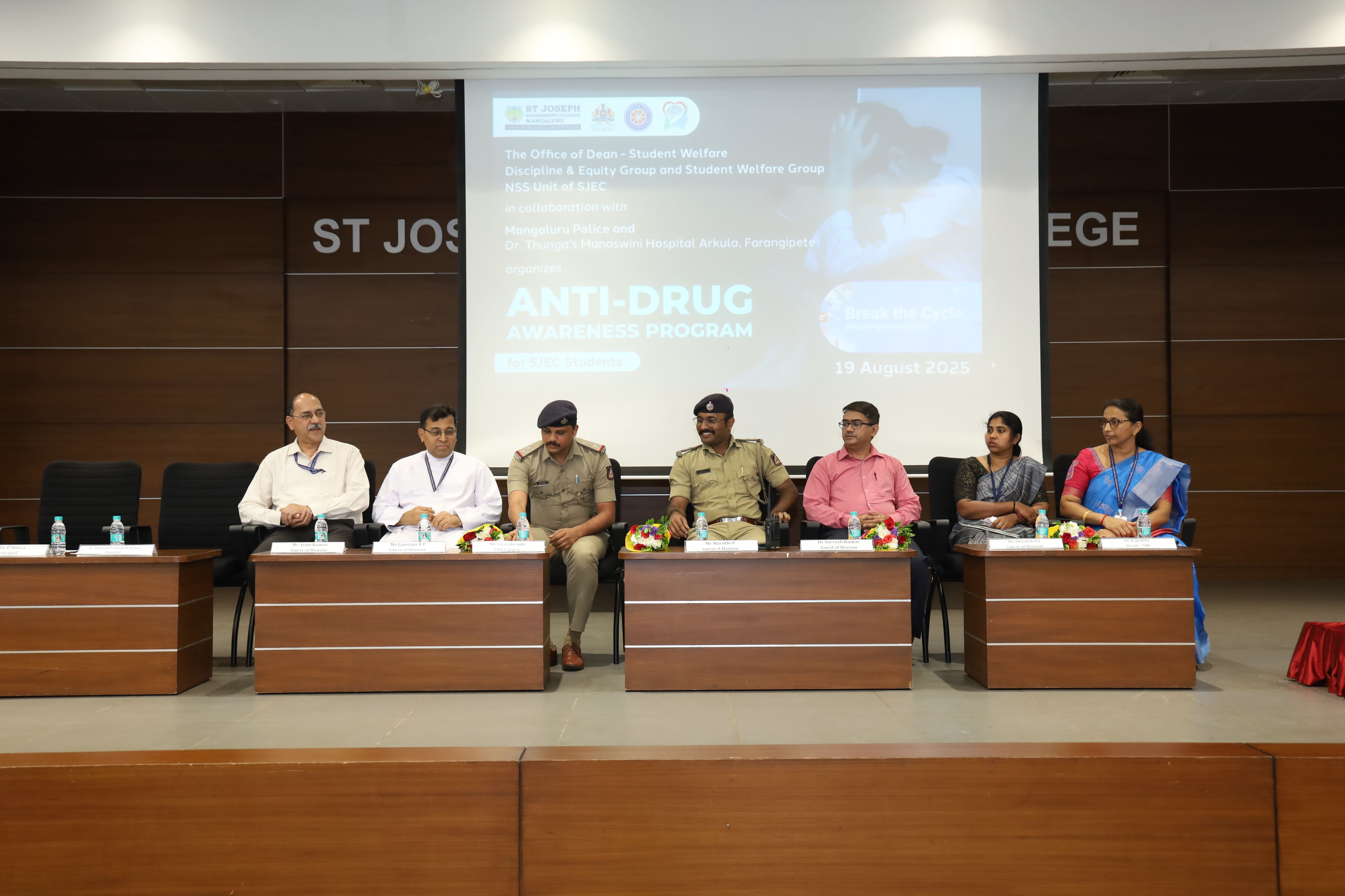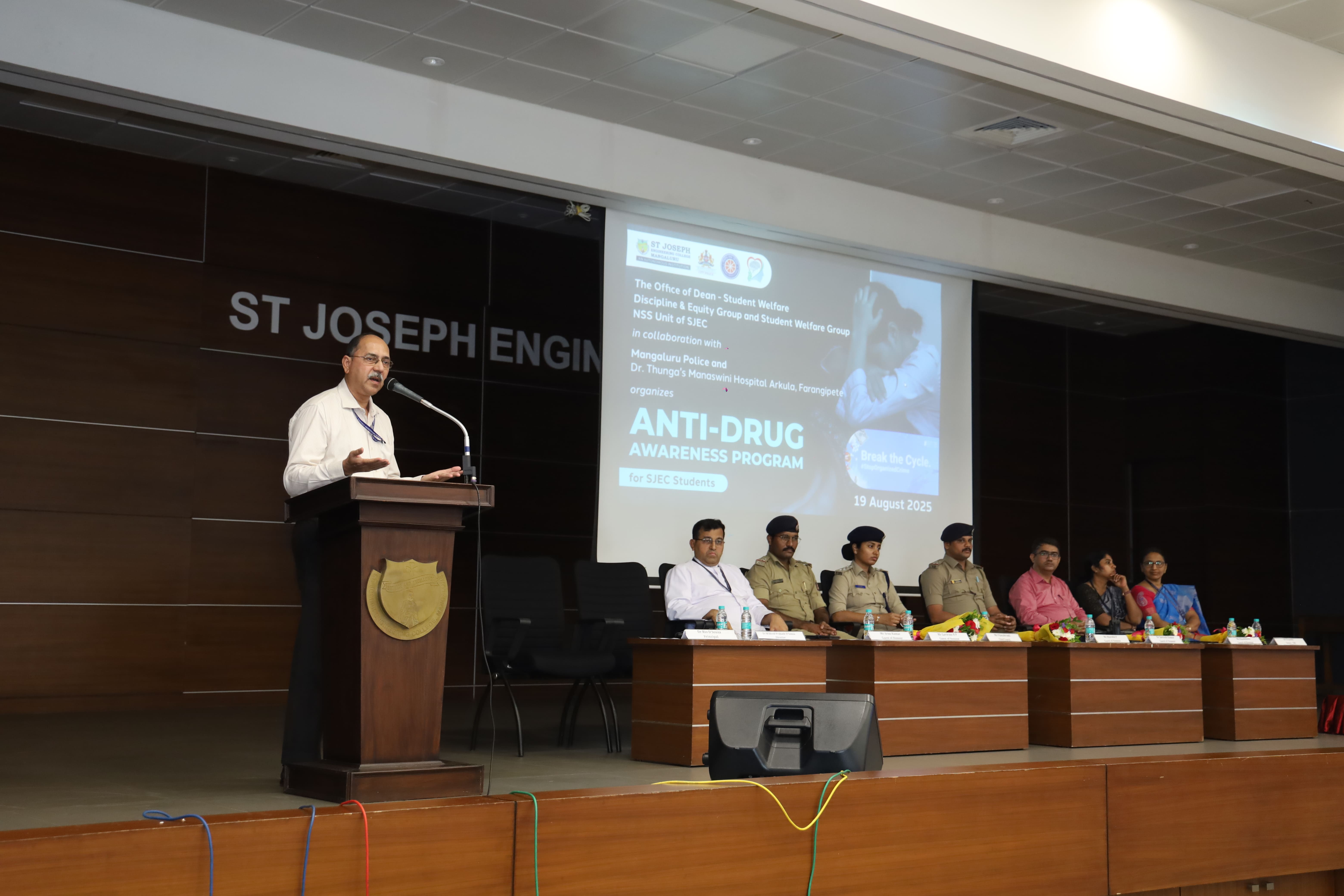 The Office of Dean – Student Welfare, Discipline & Equity Group, Student Welfare Group, NSS Unit of St. Joseph Engineering College (SJEC) in collaboration with Mangaluru City Police, Dr. Thunga’s Manaswini Hospital, Arkula, Farangipete, organized an Anti-Drug Awareness Program for 3rd Year BE students of SJEC on Tuesday, 19 August 2025, at 10:30 am in the Kalam Auditorium.