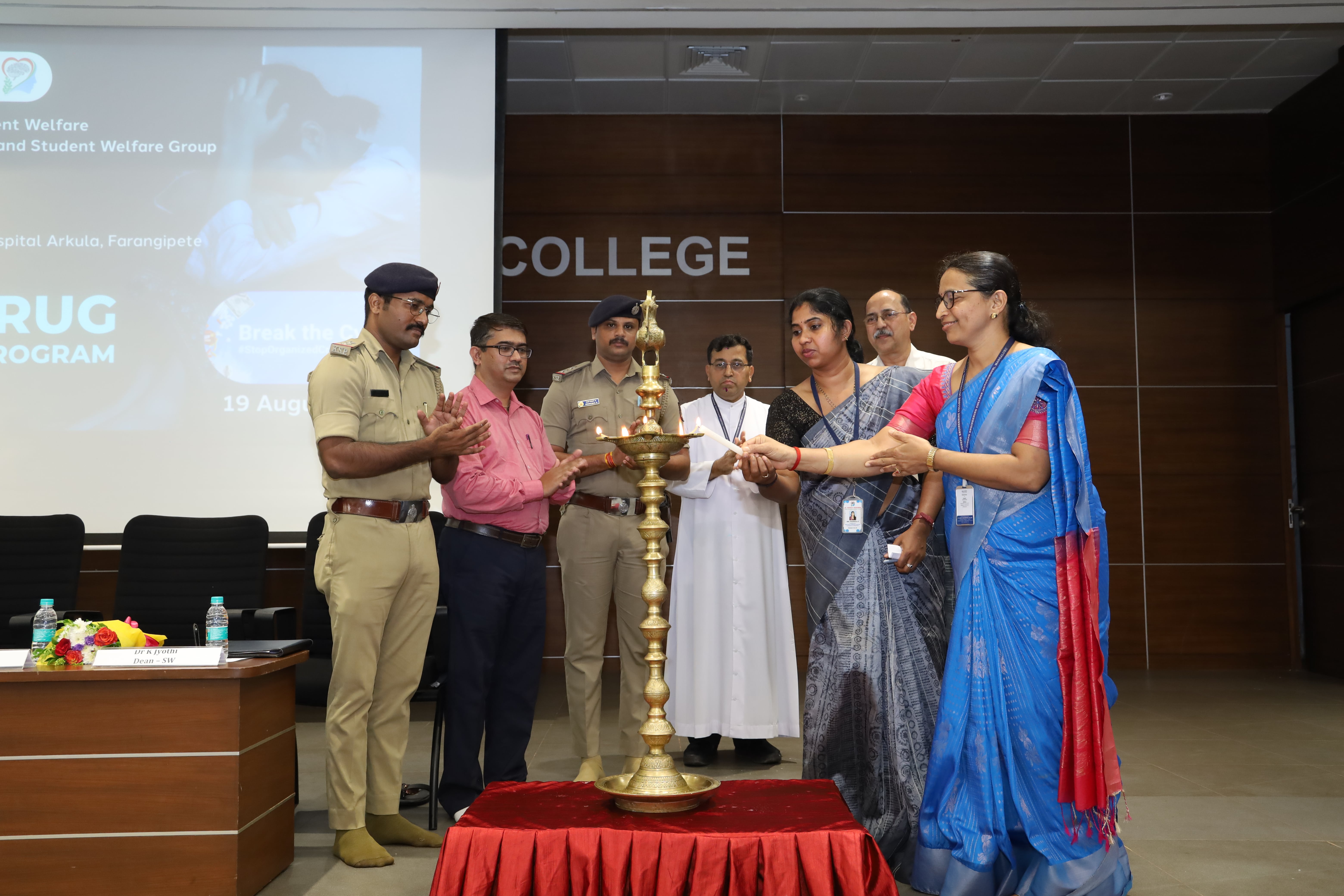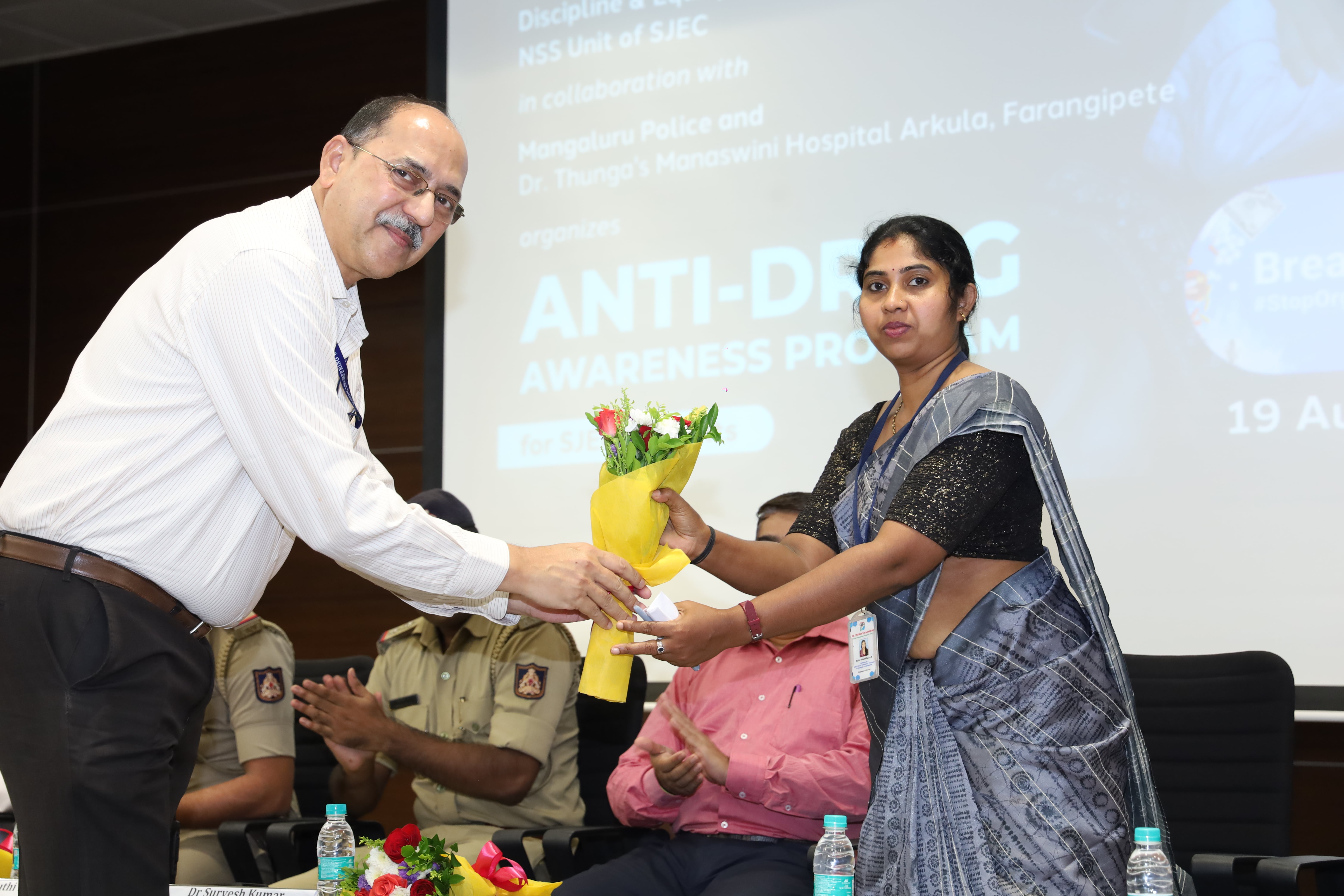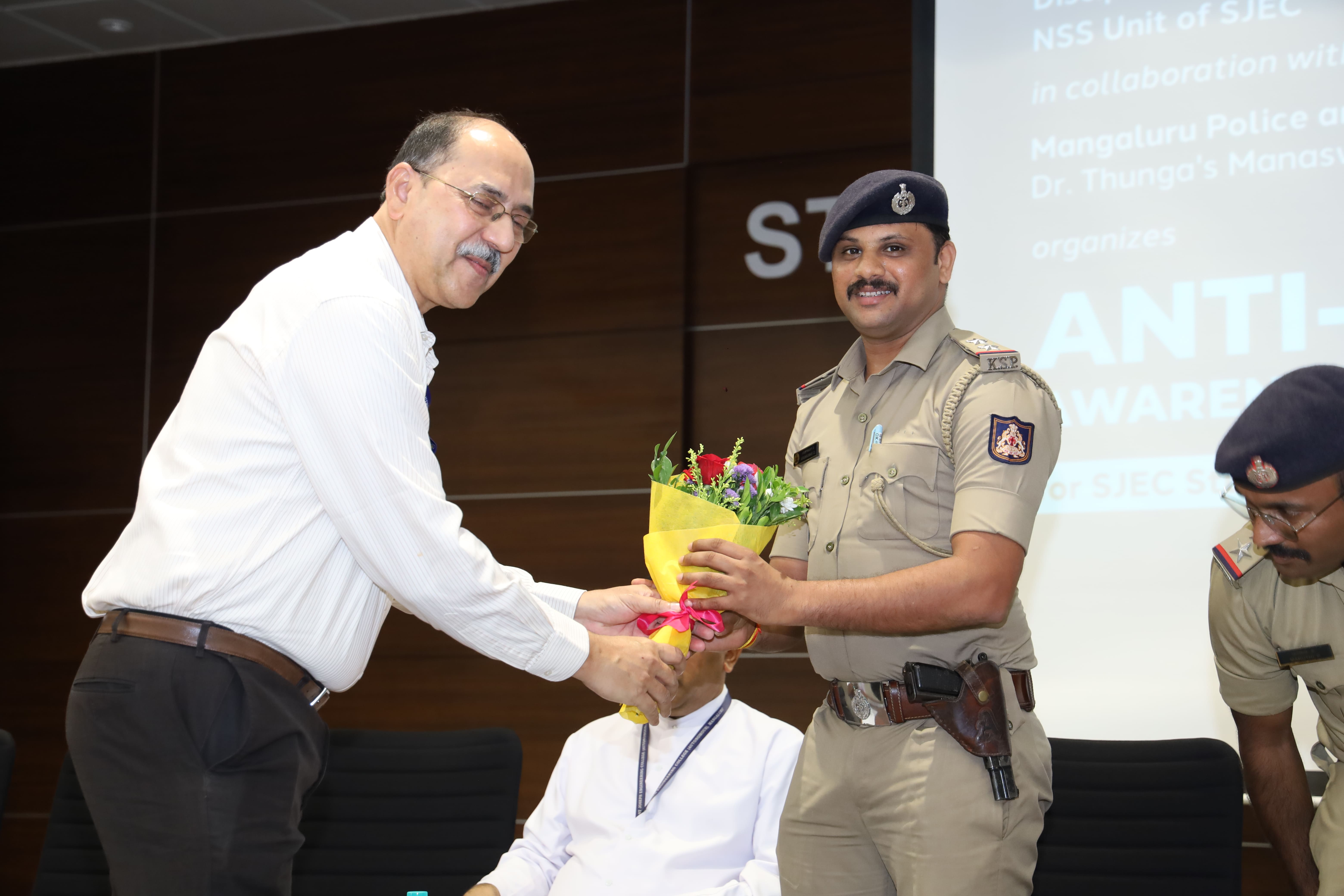 The Chief guest for the program was Ms. Vijayakranti, KSPS, ACP, Mangalore City Police. Mr. Arun Kumar, PSI, Mangaluru Rural Police Station, Mr. Maruthi P, PSI, Mangaluru South Police Station, Dr. Survesh Kumar, MBBS, DNB, Psychiatry of Consultant Psychiatrist Community Services & Academic Programs, Dr. Thunga’s Manaswini Hospital, Ms. Shashikala, Counsellor & Co-ordinator of Community Services and Academic Programs, Dr. Thunga’s Manaswini Hospital were the guests of honor. Rev. Fr Wilfred Prakash D’Souza, Director, SJEC presided over the program. Dr. Rio D’Souza, Principal, Dr. Purushotama Chippar, Vice Principal, and Dr. K. Jyothi, Dean – Student Welfare, SJEC were the other dignitaries for the program. The dignitaries were escorted onto the dais by Ms. Olivia Sequeira, Dr. Saumya Y M and Ms. Prathibha K N, coordinators of the program.