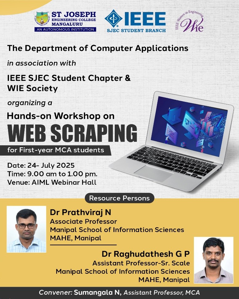A hands-on workshop on Web Scraping was successfully conducted by the Department of Computer Applications in association with IEEE Student Chapter and WIE Society, on 24th July 2025 with the objective of introducing participants to both the foundational and advanced aspects of web scraping techniques. The workshop was graced by eminent resource persons Dr. Prathviraj N and Dr. Raghudathesh G P from Manipal Academy of Higher Education (MAHE).