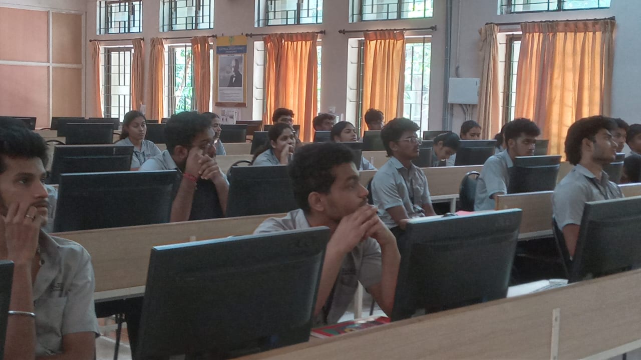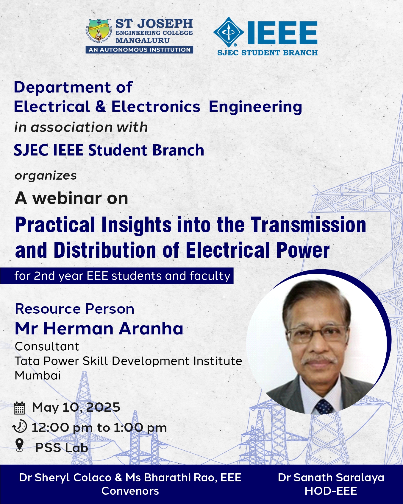 The Department of Electrical and Electronics Engineering (EELS), in collaboration with IEEE, recently conducted a seminar on the Transmission & Distribution of Electrical Power focusing on the intricacies of Electrical Power Transmission & Distribution. During the seminar, Mr. Aranha delved into various topics, including the design of Transmission Towers, the significance of different Transmission Voltages, and the impact of factors like Sag. Additionally, he shared insightful case studies highlighting the critical role of ELCBs in ensuring safety measures. Emphasizing the pivotal role of engineers, Mr. Aranha stressed the importance of their comprehensive understanding of installation practices and safety protocols for effective project supervision. Around 54 students participated in the seminar.