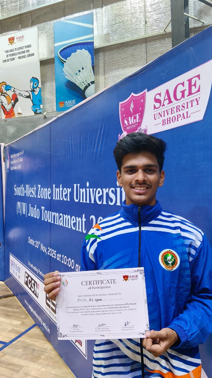 Ms Shourya S Shetty II year MBA and Mr R S Vignesh I year CSE represented VTU in South West Zone Inter University Judo Championship held at Sanjeev Agrawal Global Educational (SAGE) University Bhopal (MP). from 10 to 14 November 2025.