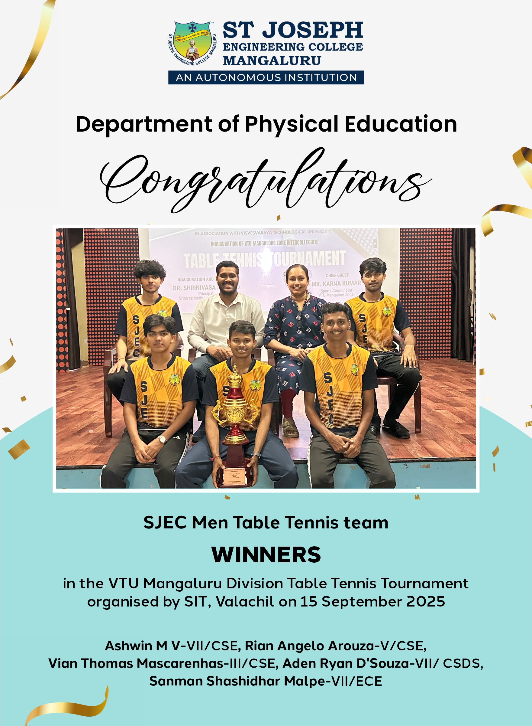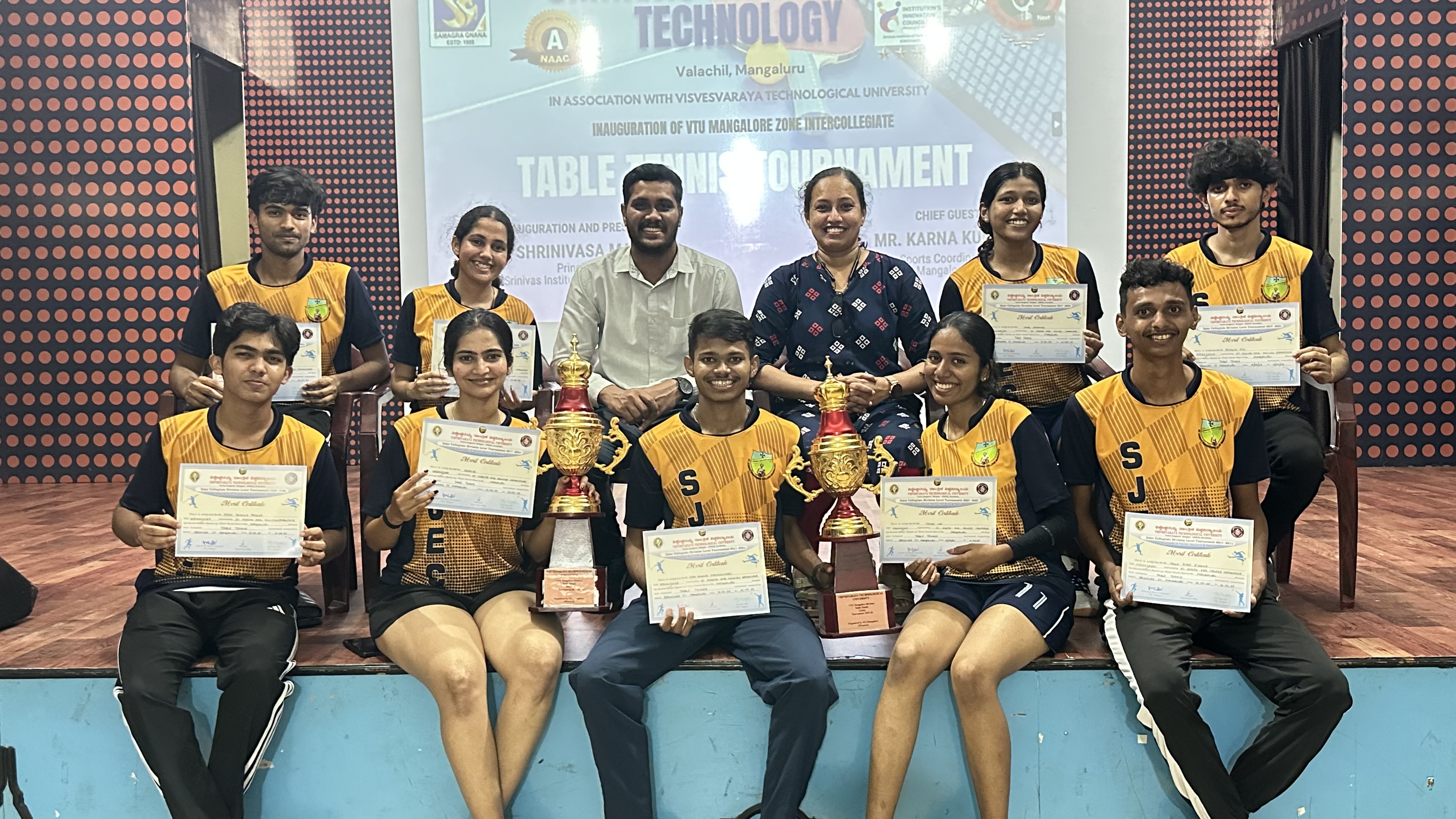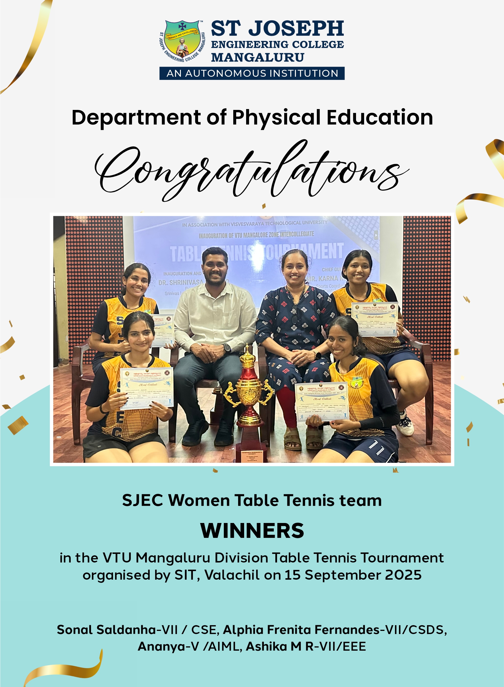 SJEC Men and Women Table Tennis teams participated in VTU Mangaluru Division Table Tennis Tournament organized by SIT, Valachil on 15 September 2025. SJEC Men & Women Table Tennis teams secured the Winners in the Table Tennis tournament.
