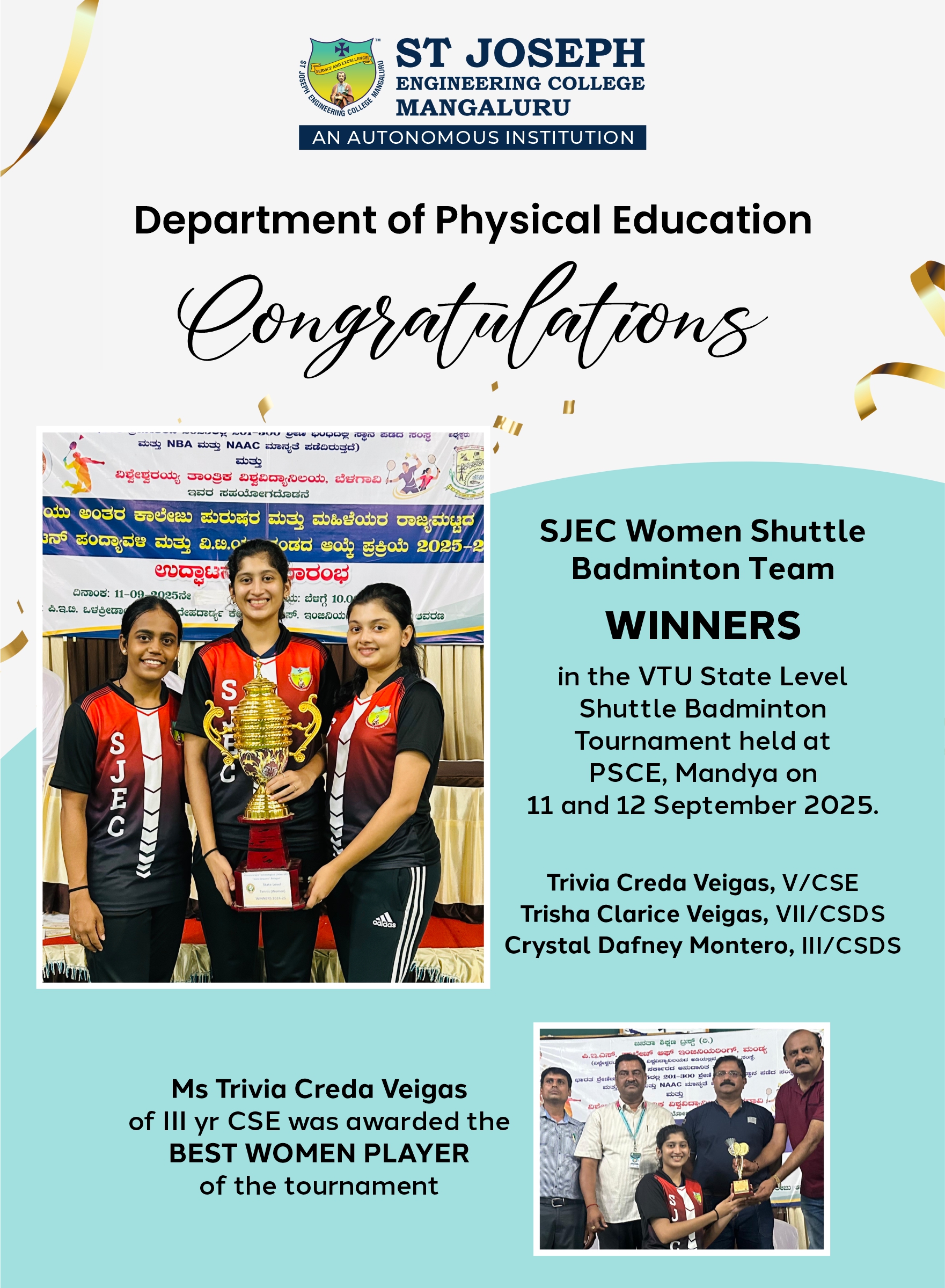 SJEC Men and Women team participated in VTU State Level Shuttle Badminton Tournament at PESCE, Mandya from 11 to 13 September 2025. SJEC women Shuttle Badminton team secured Winners in the VTU State Level Shuttle Badminton Tournament. Ms Trivia Creda Veigas III year CSEwas Awarded Best Women player of the Tournament.