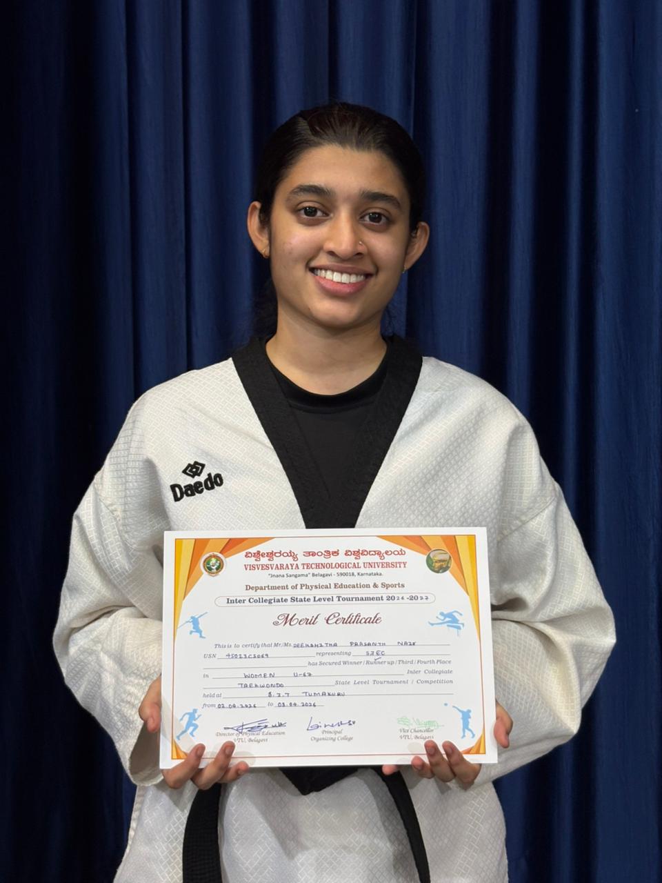 • Ms. Deekshitha Prasanth Nair (VI Sem CSE) secured Second Place in the Below 67 kg category.