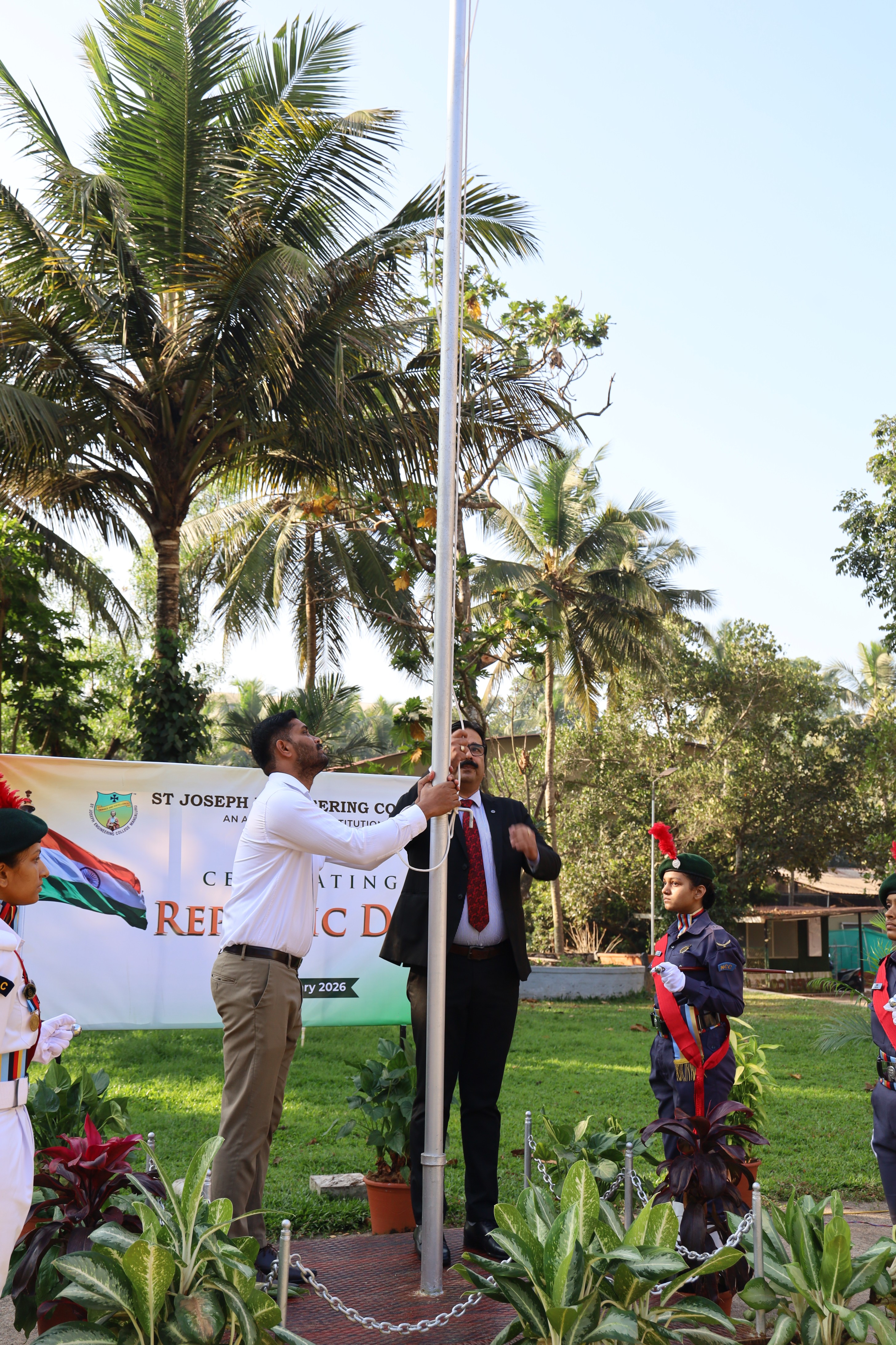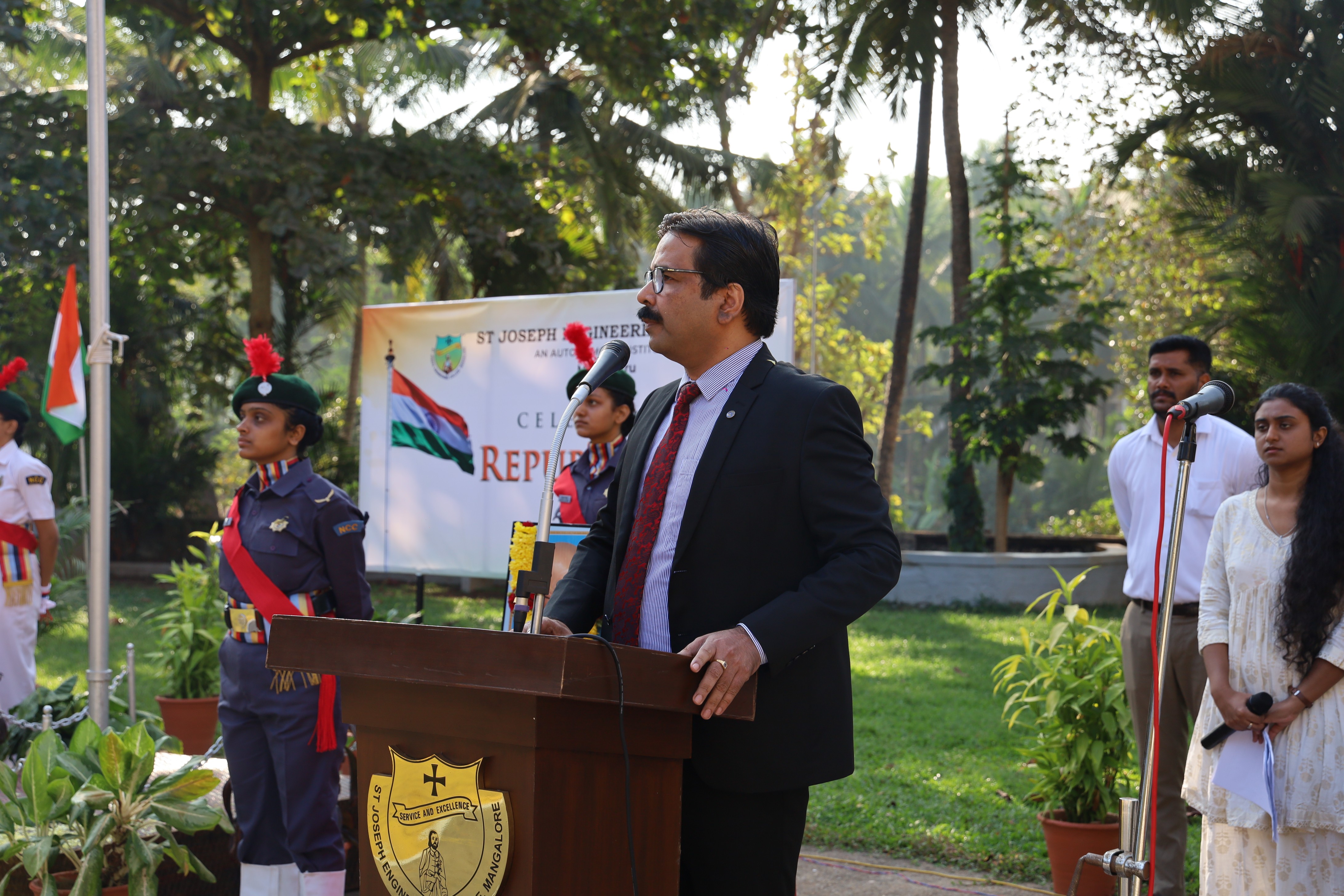 The Republic Day was celebrated with great pride and enthusiasm on 26 January at SJEC. The occasion marked the adoption of the Constitution of India and reflected the spirit of unity, democracy, and patriotism among students and staff. The Republic Day of our Nation was celebrated with pomp and show, zeal and spirit in SJEC at 8:30 am in the Basketball Court. Dr Melwyn D’Souza HOD CSE -SJEC graced the occasion as the Chief Guest. Rev. Fr. Wilfred Prakash D’Souza - Director SJEC, Rev. Fr Kenneth Rayner Crasta Asst Director – SJEC, Dr Rio D’Souza, Principal – SJEC, were the other dignitaries present for the occasion.